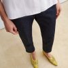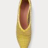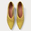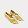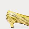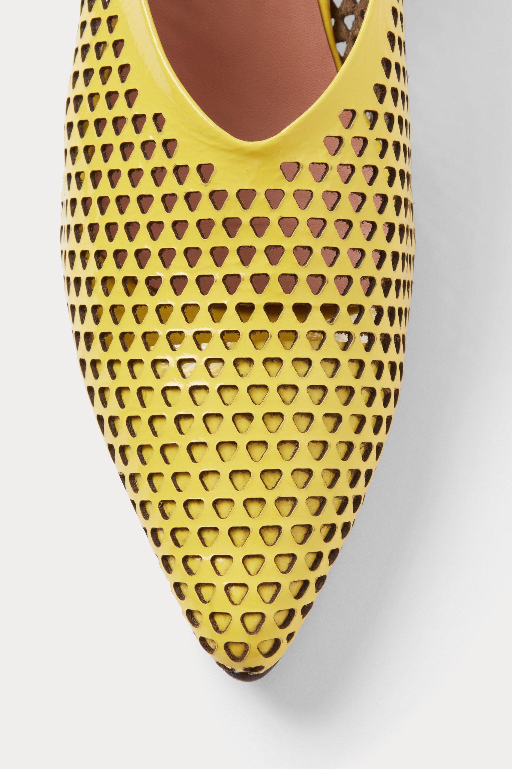 Pointed-toe kitten heel with a perforated triangular design on crinkle patent leather that conforms elegantly to the foot.