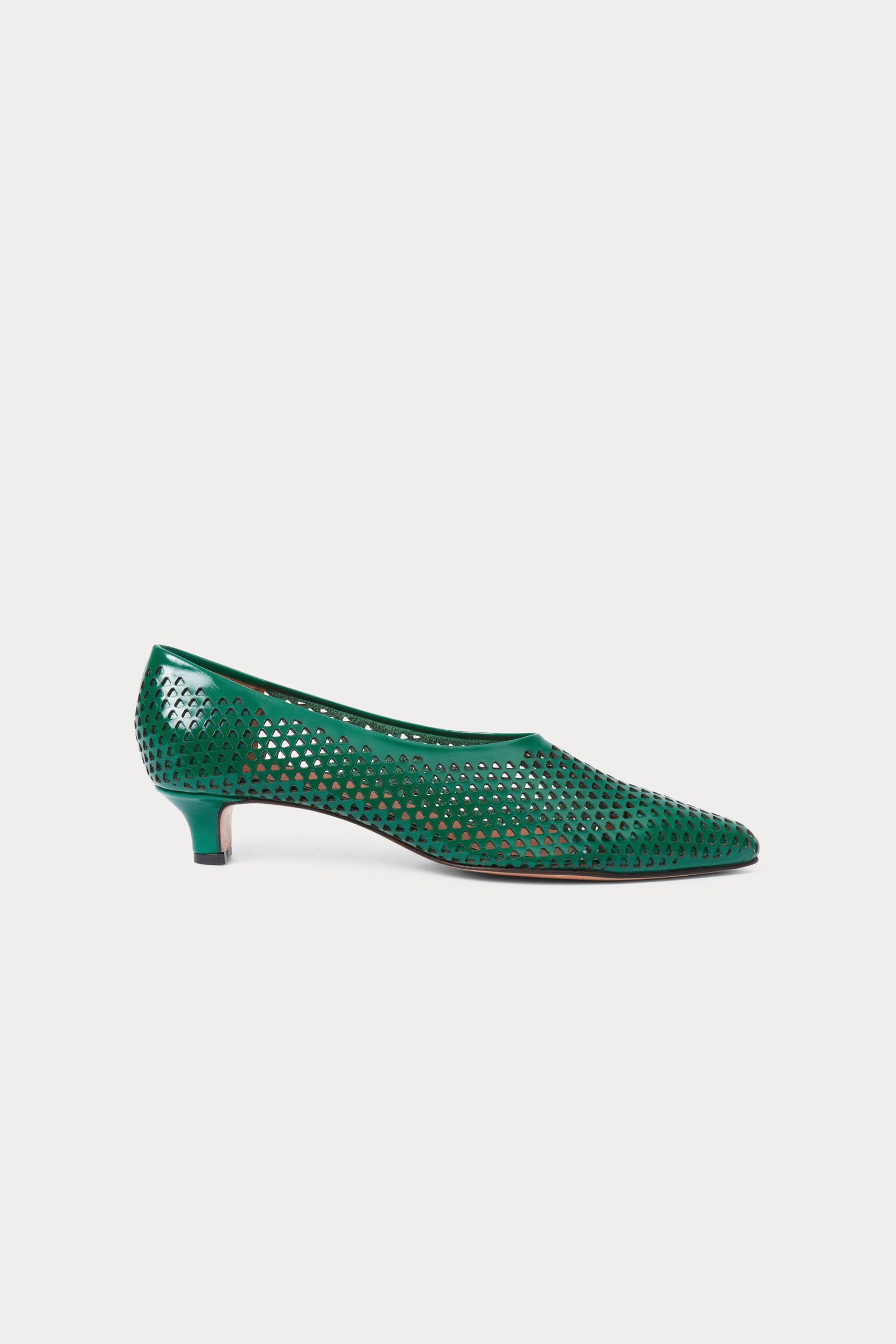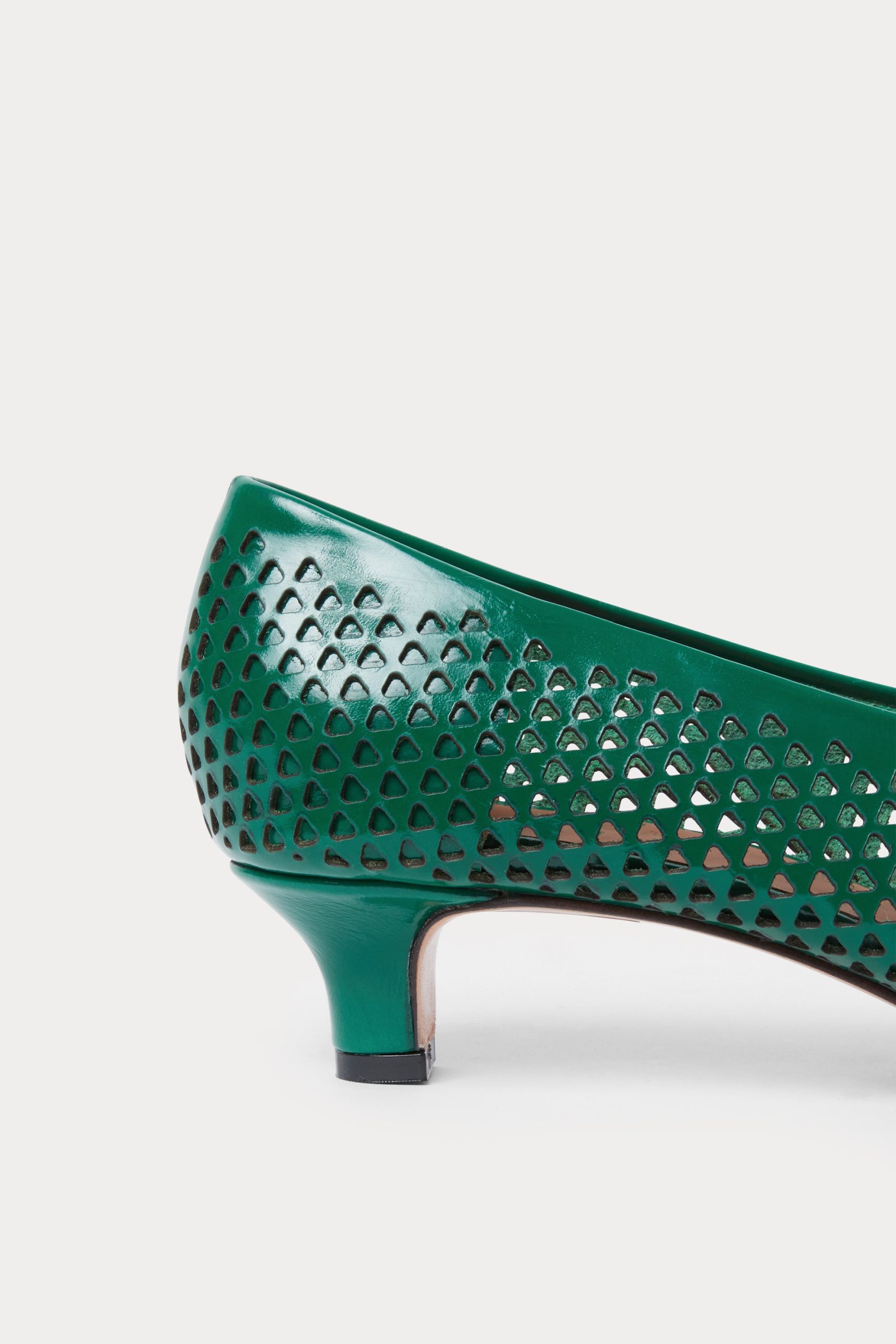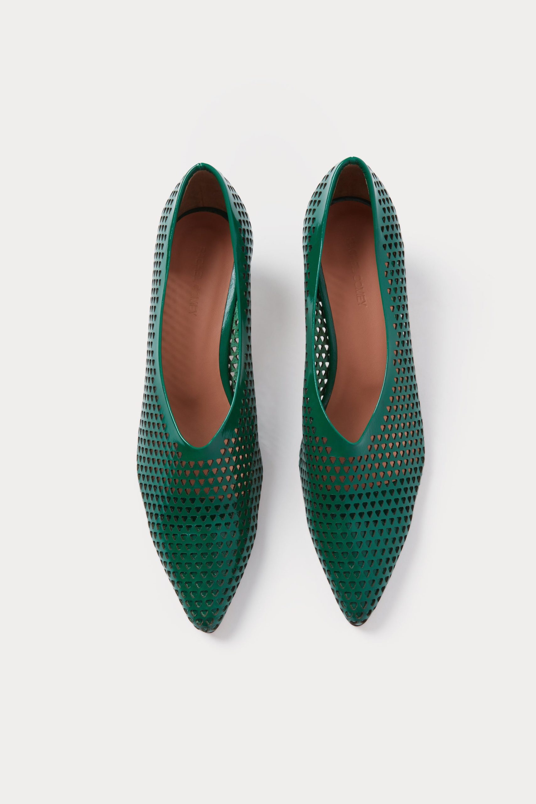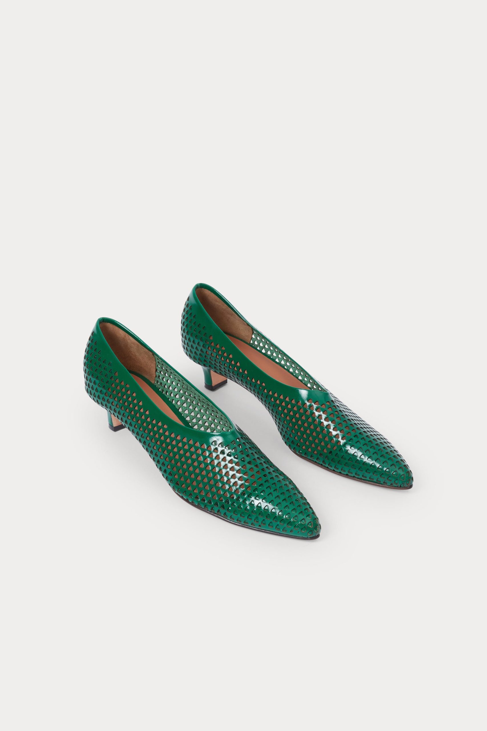 Pointed-toe kitten heel with a perforated triangular design on crinkle patent leather that conforms elegantly to the foot.