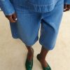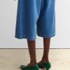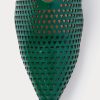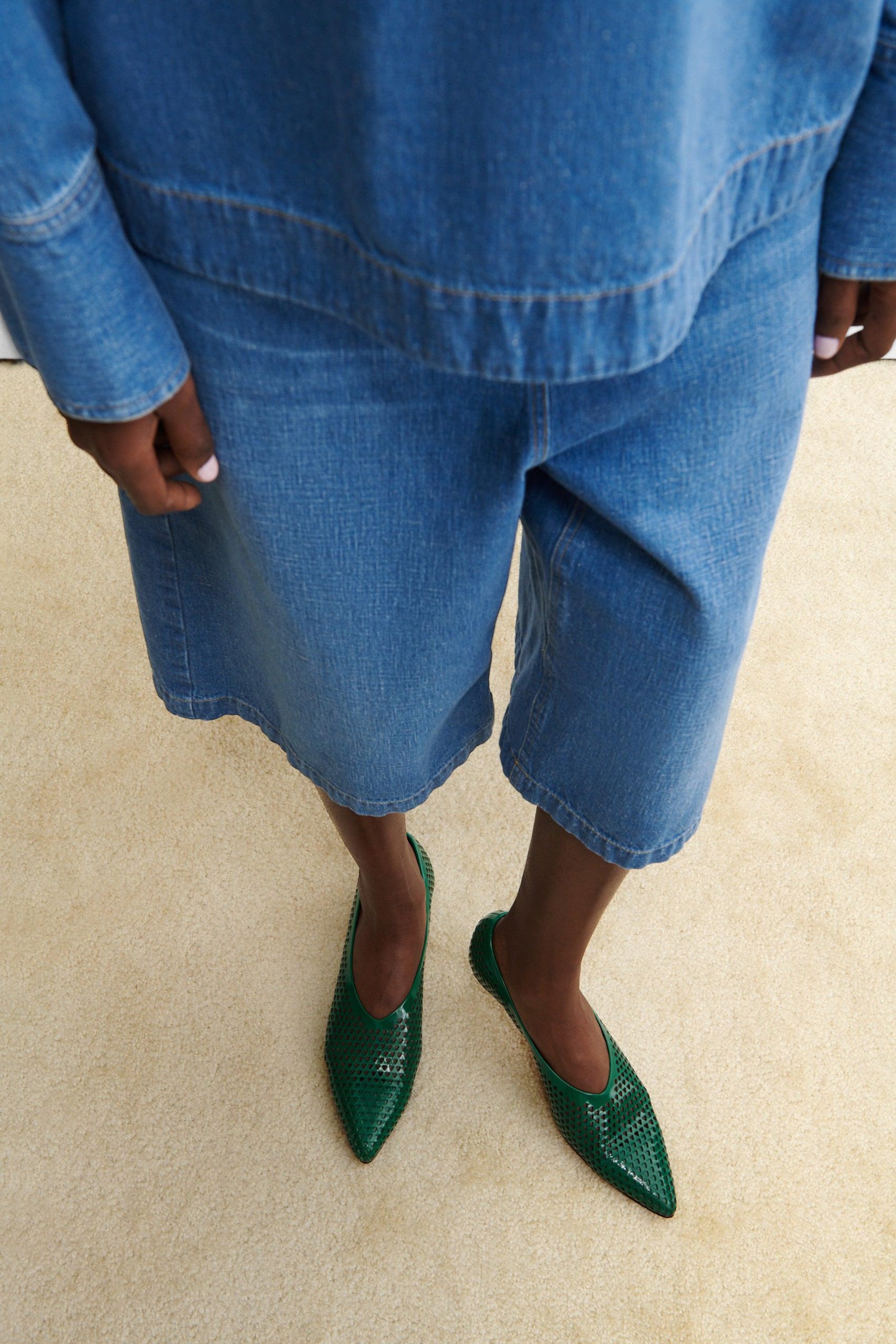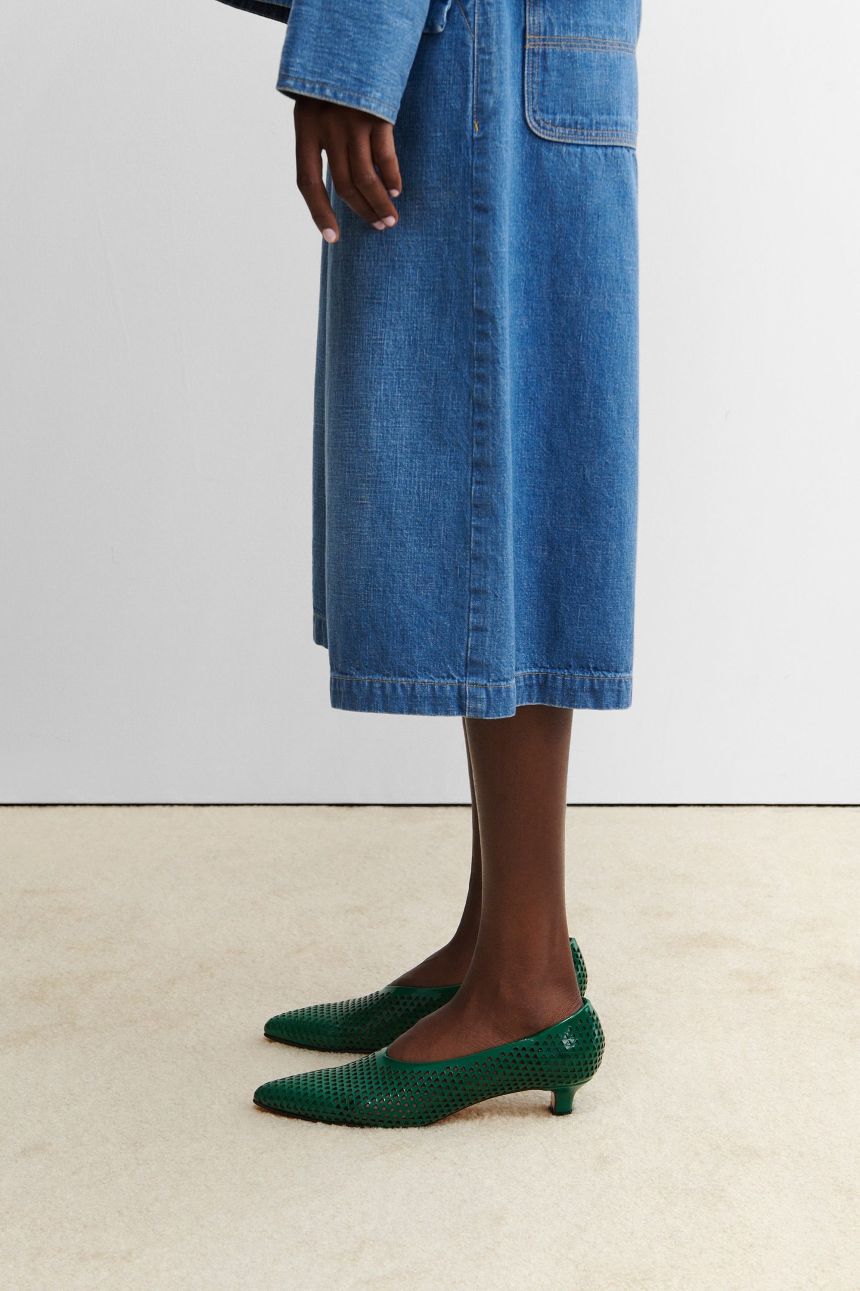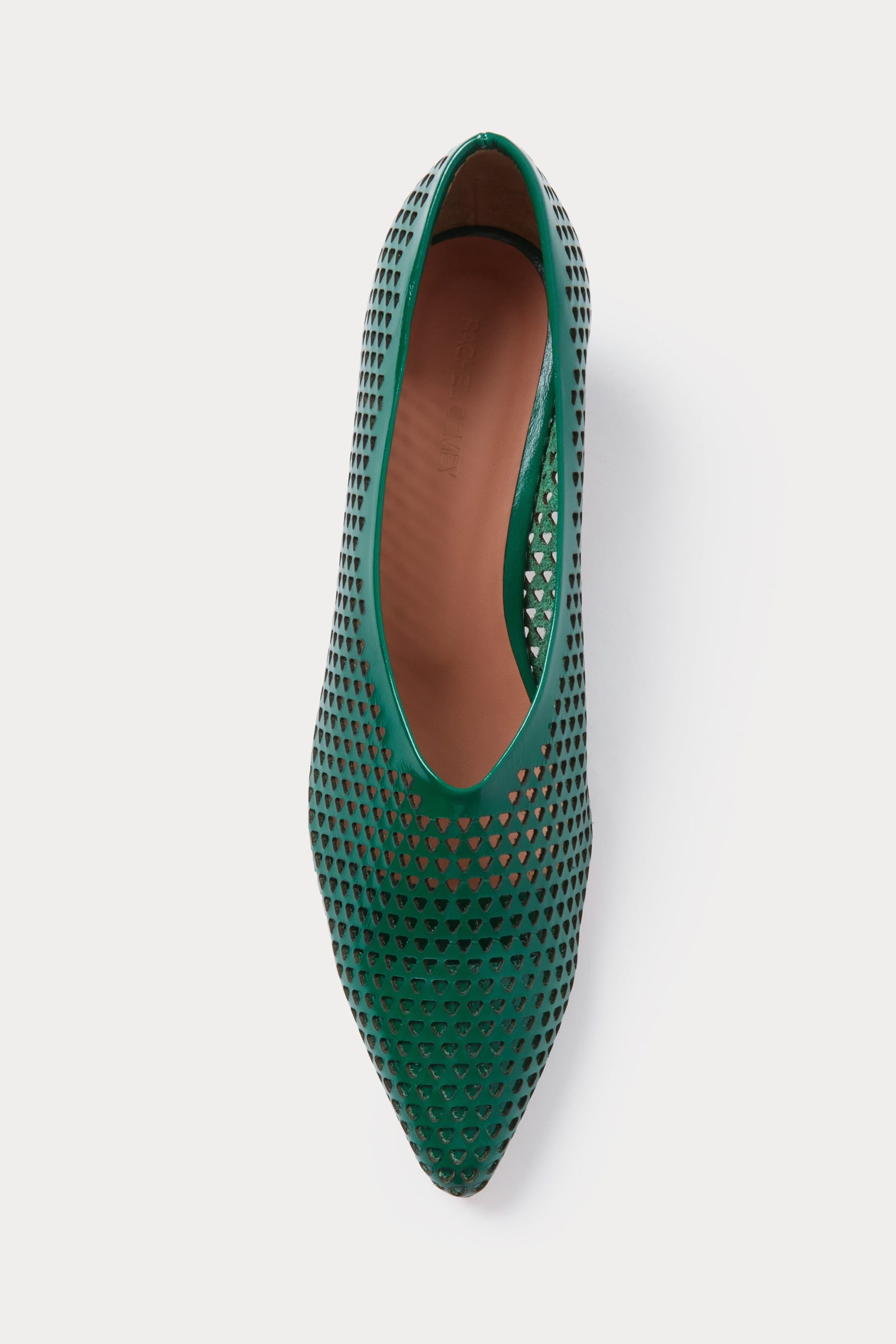 Pointed-toe kitten heel with a perforated triangular design on crinkle patent leather that conforms elegantly to the foot.