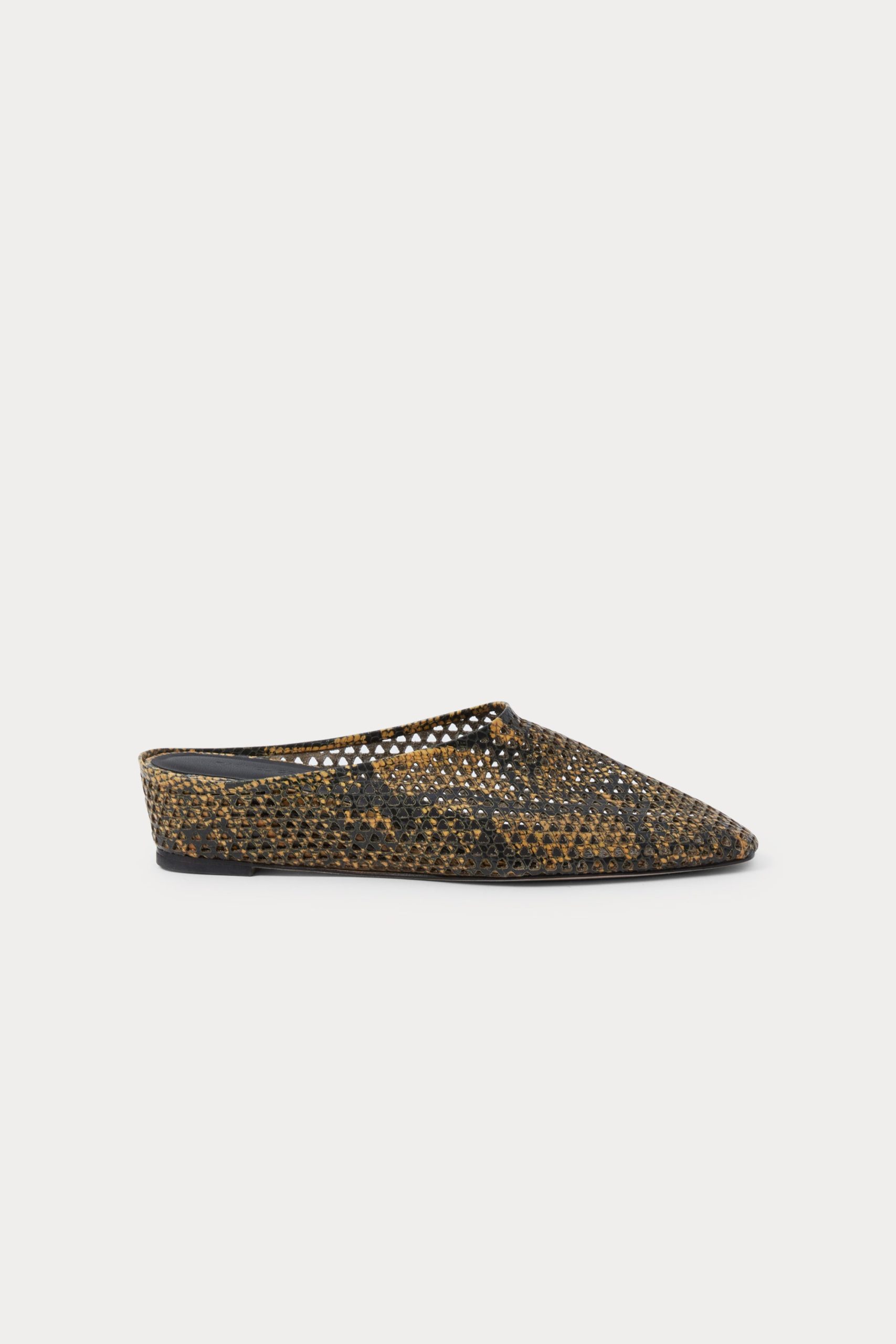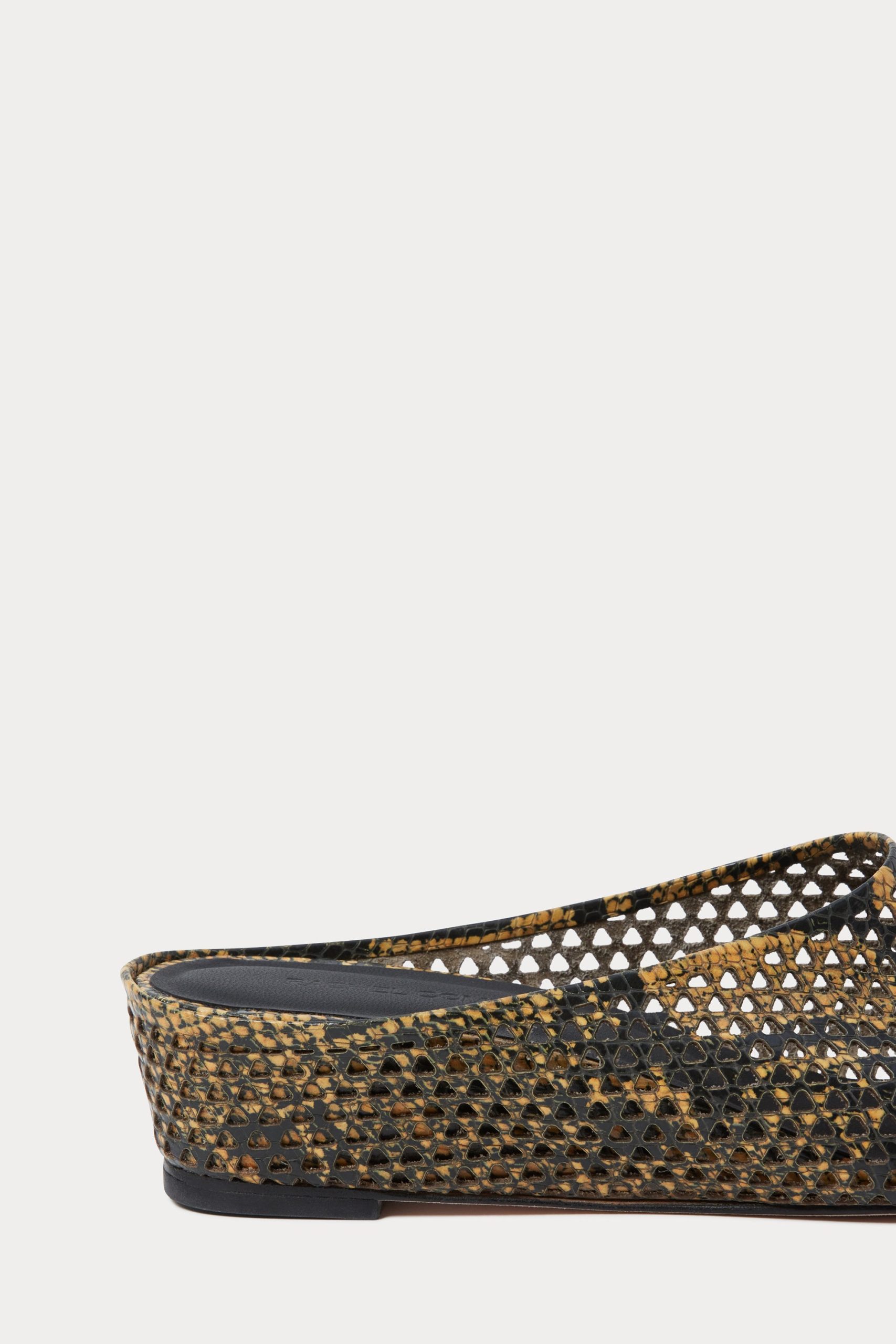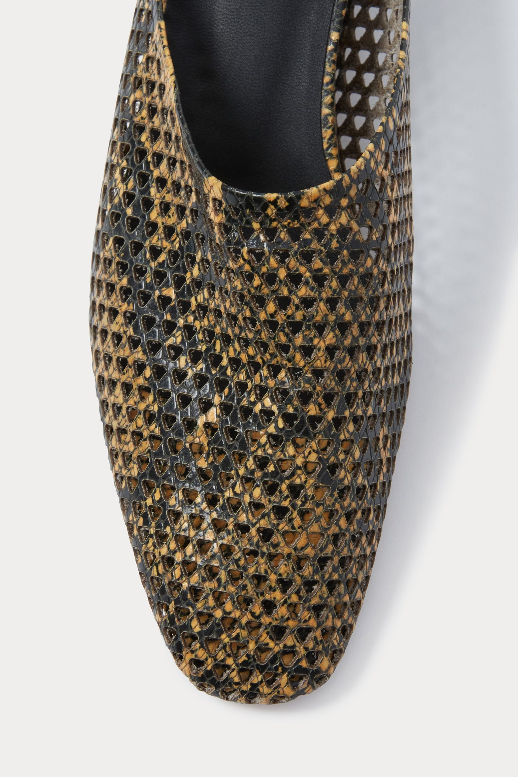 Perforated leather wedge. Features a snakeskin print and almond-shaped toe.