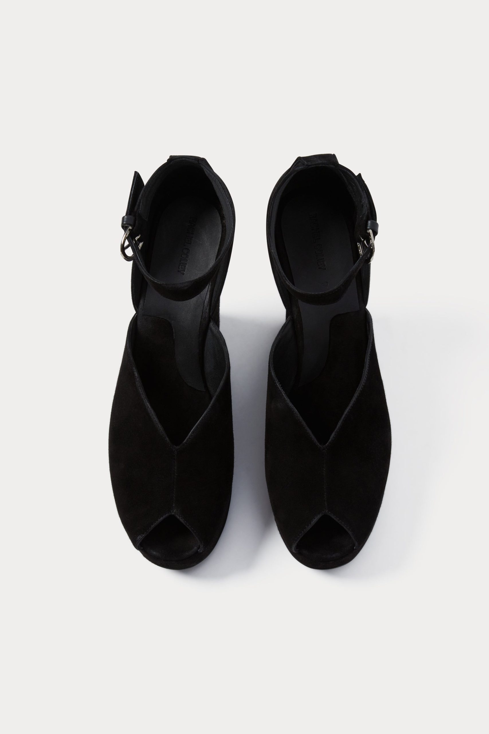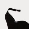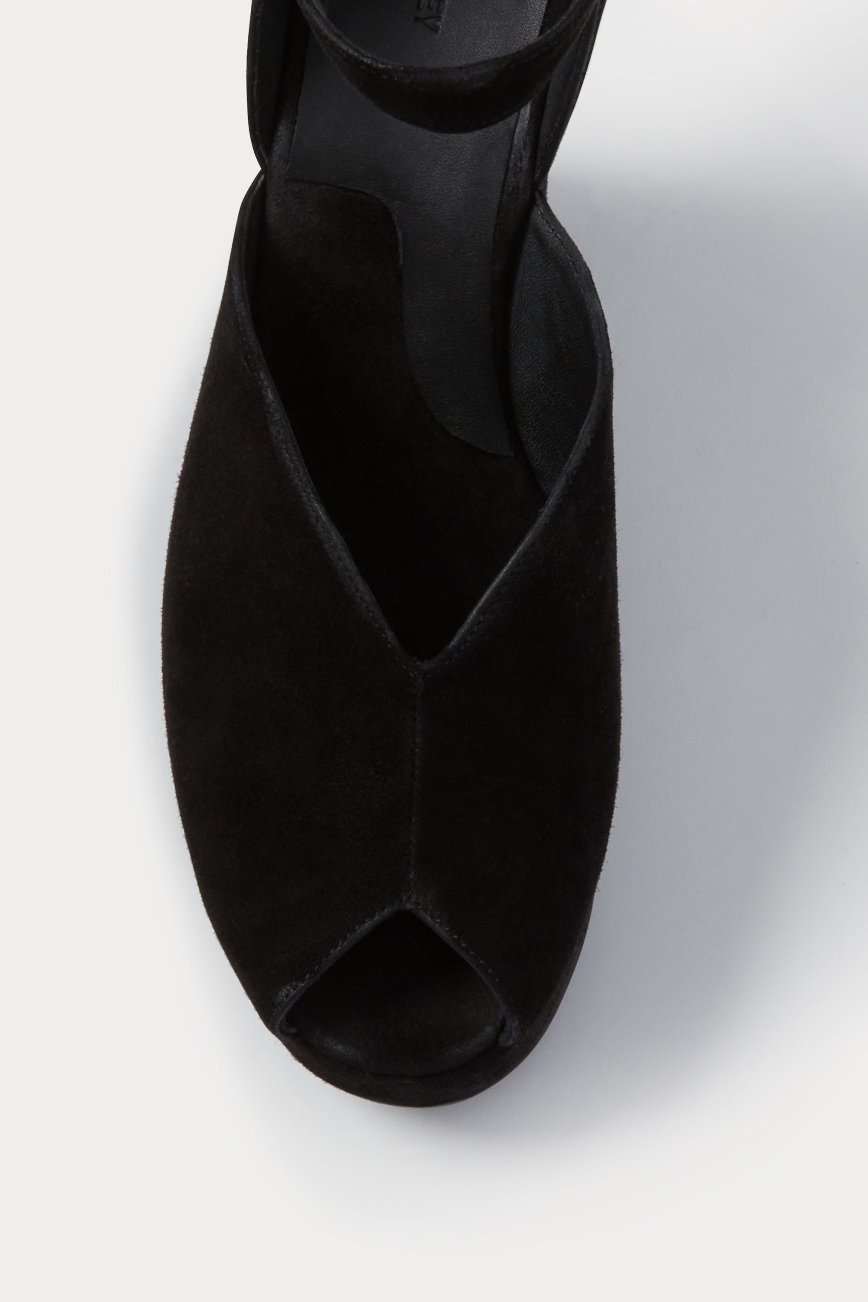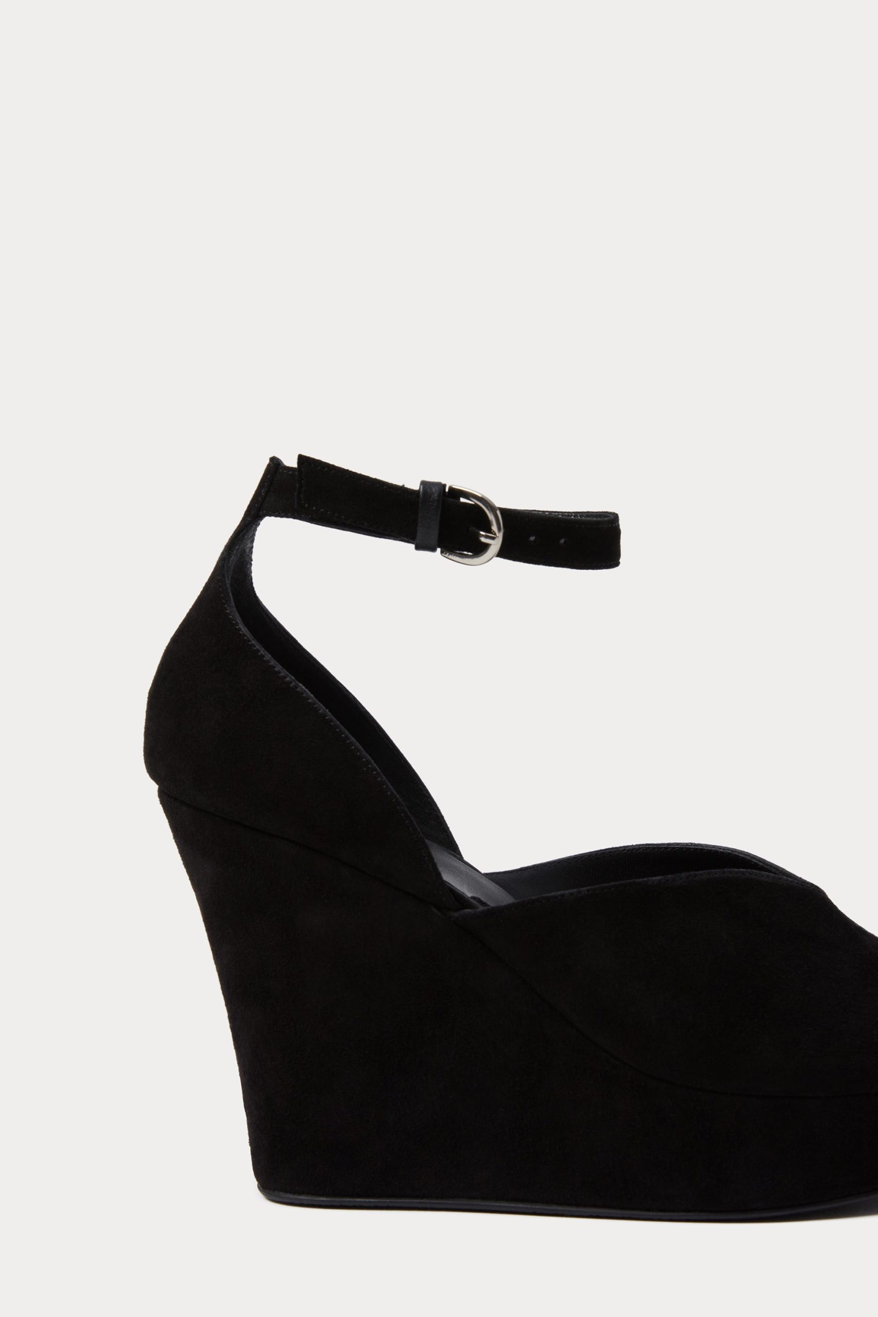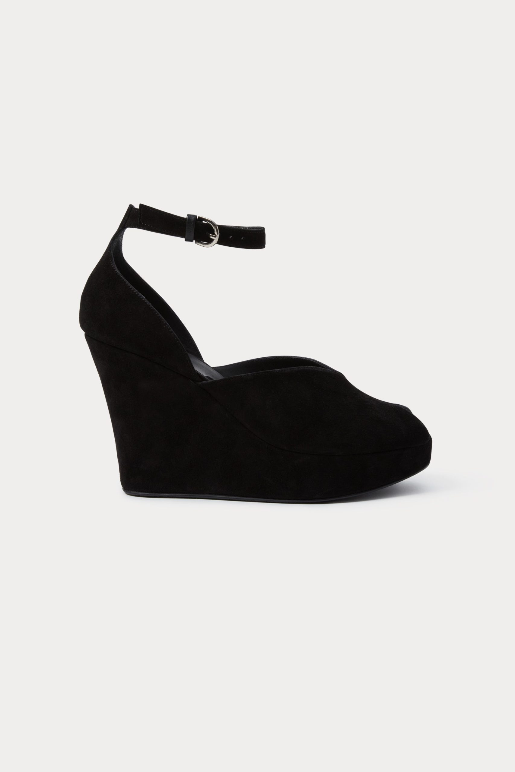 Peep-toe suede wedge heel with a low-cut vamp. Features an ankle strap with a buckle closure.