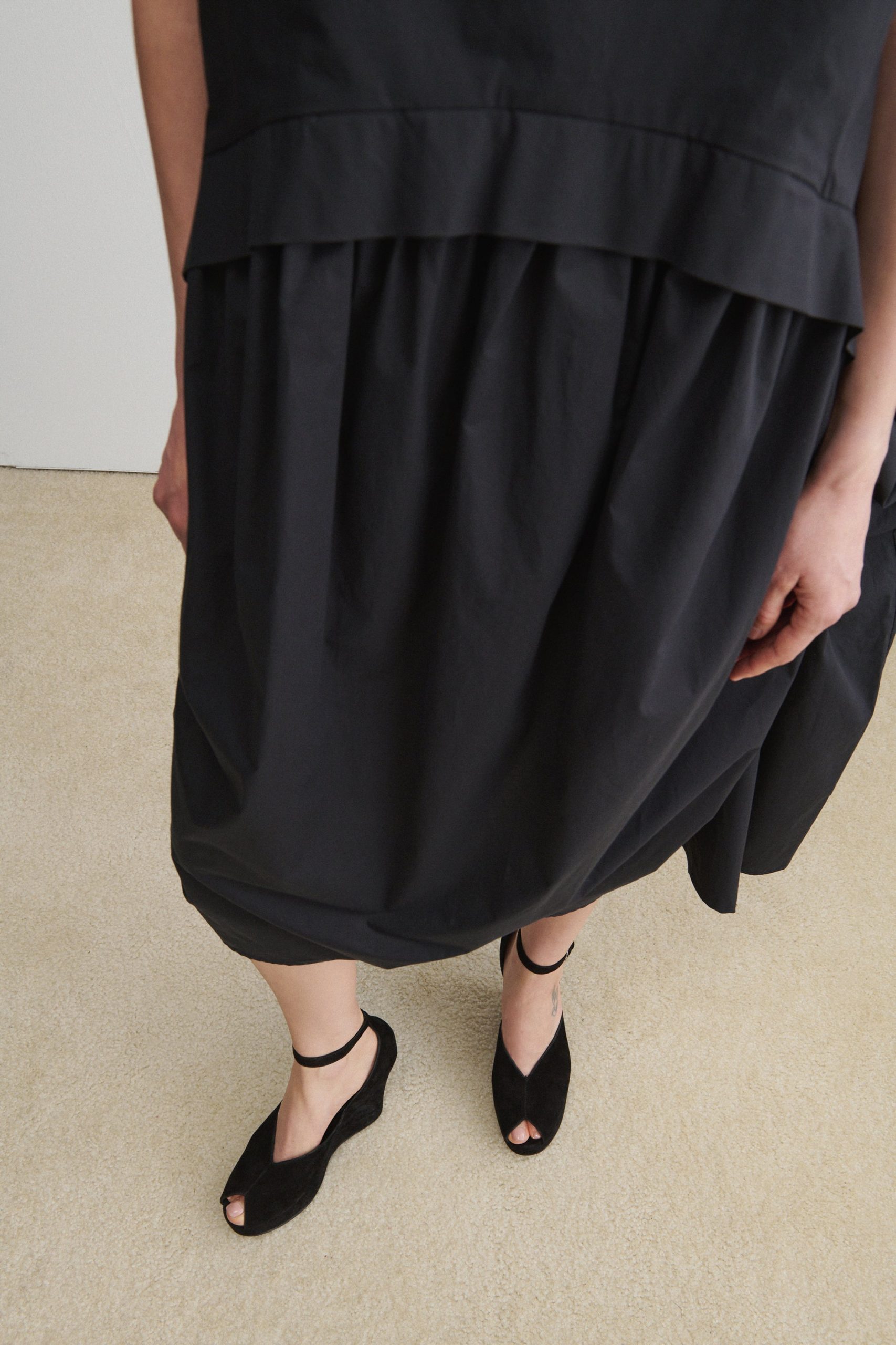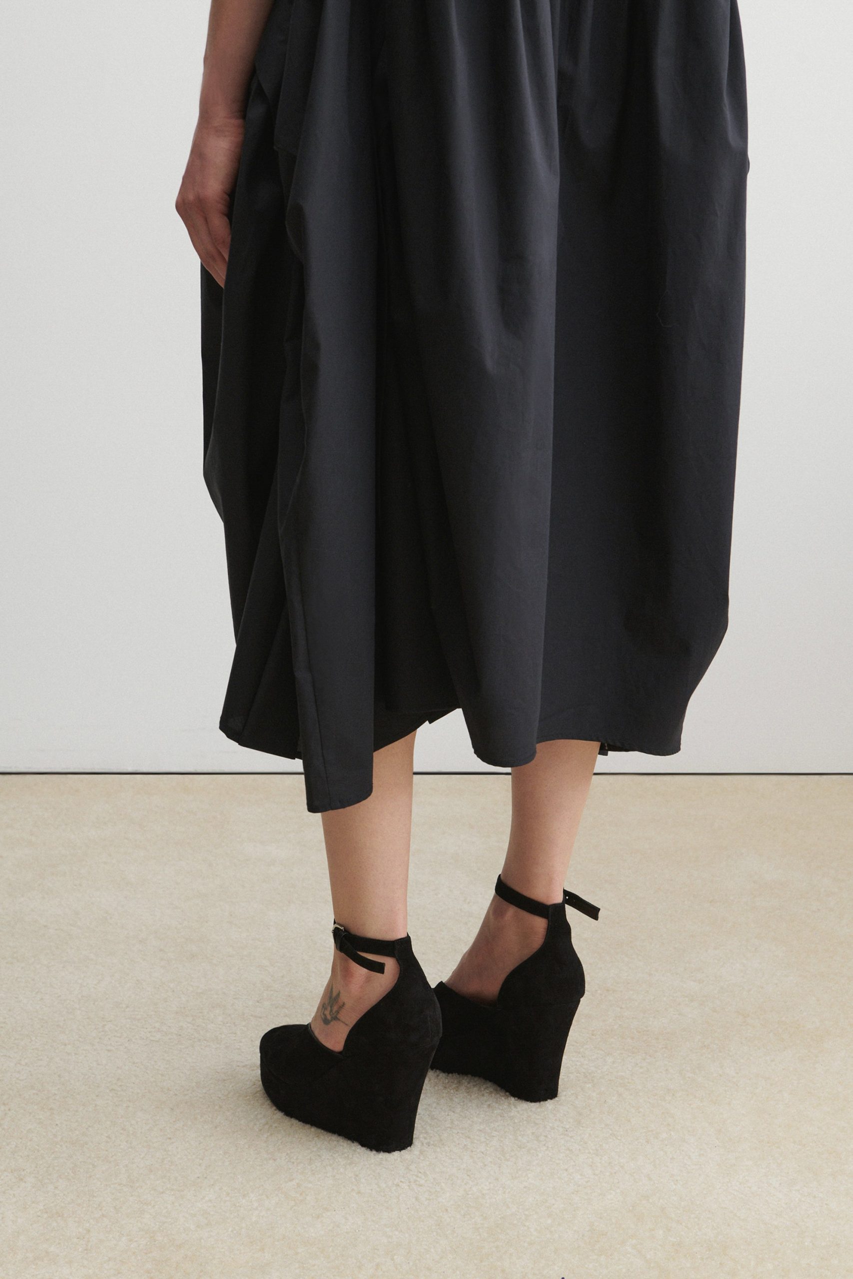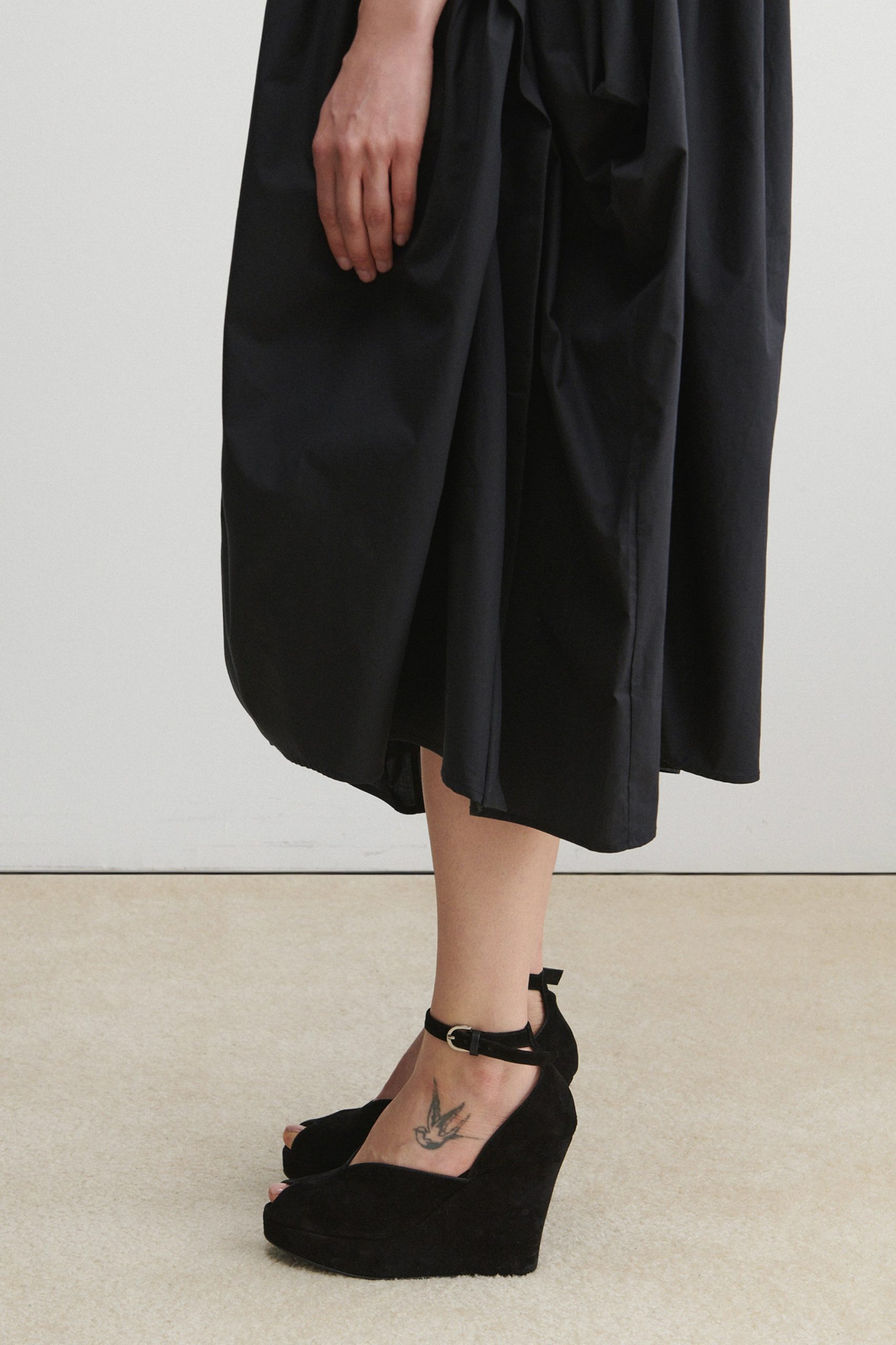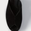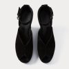 Peep-toe suede wedge heel with a low-cut vamp. Features an ankle strap with a buckle closure.