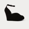 Peep-toe suede wedge heel with a low-cut vamp. Features an ankle strap with a buckle closure.