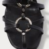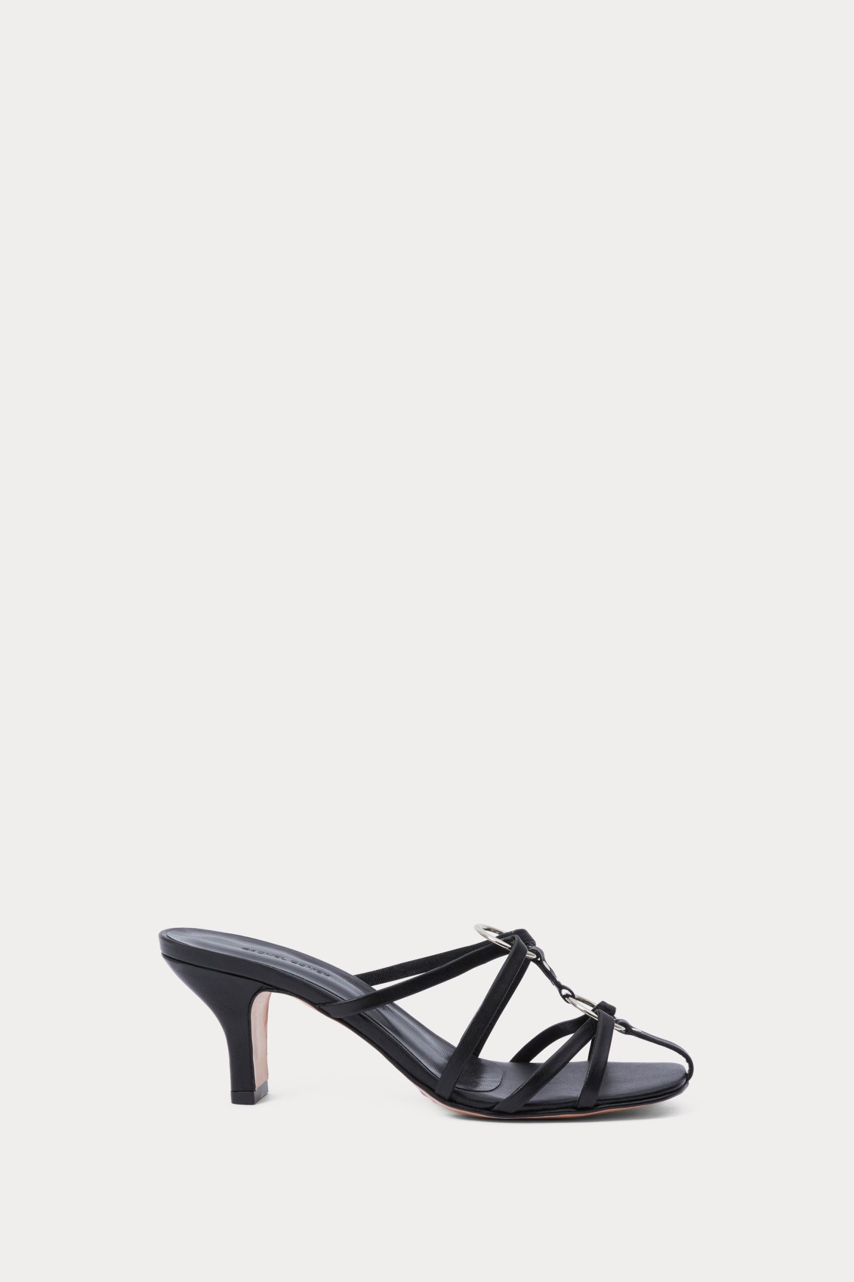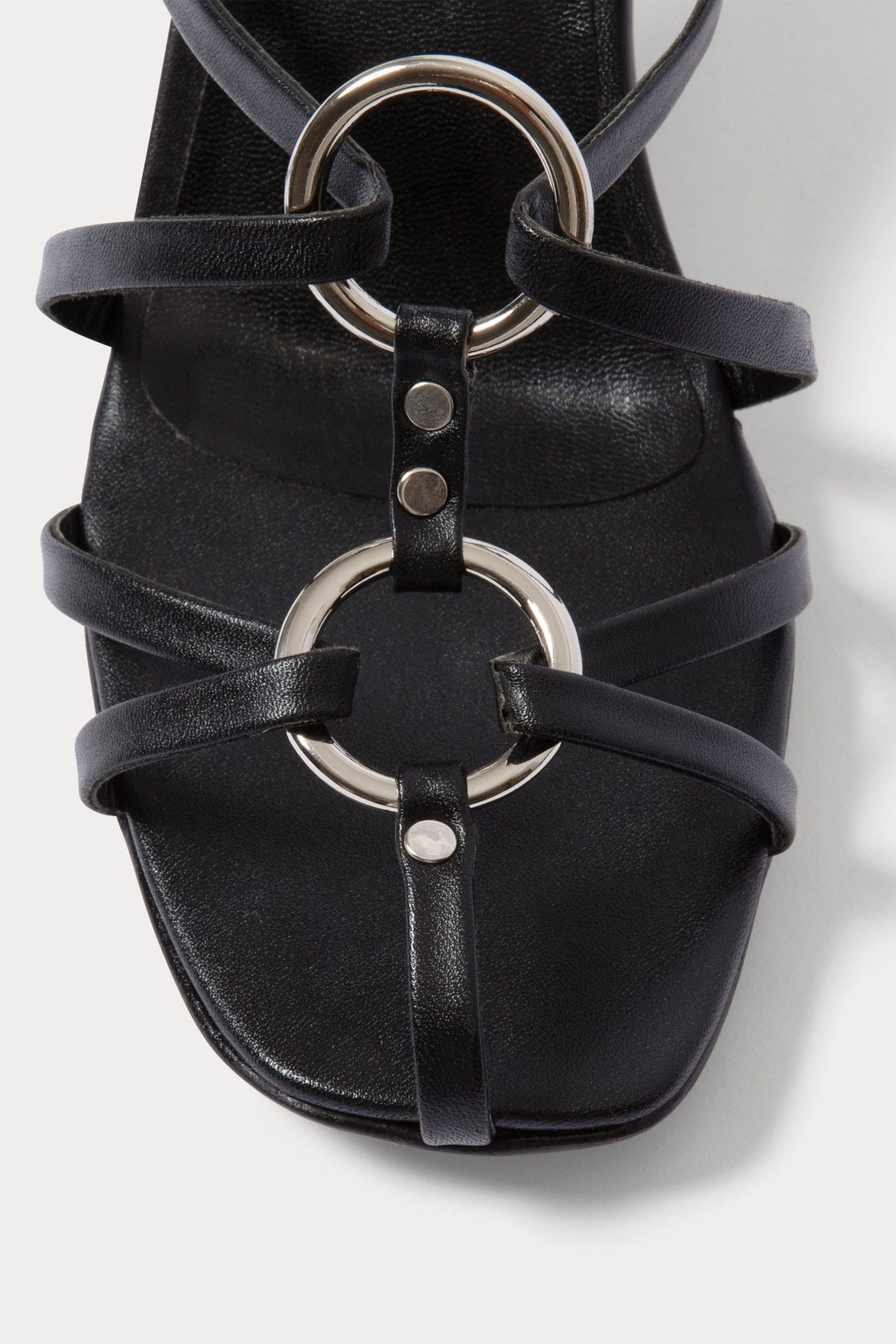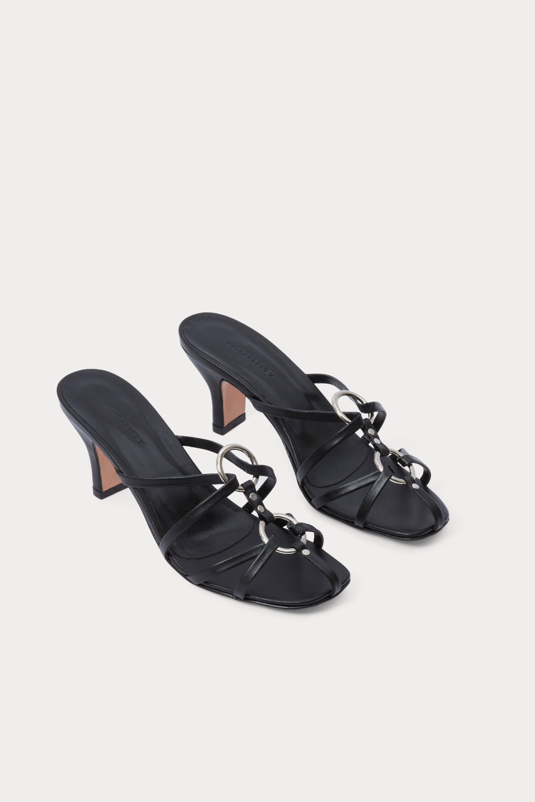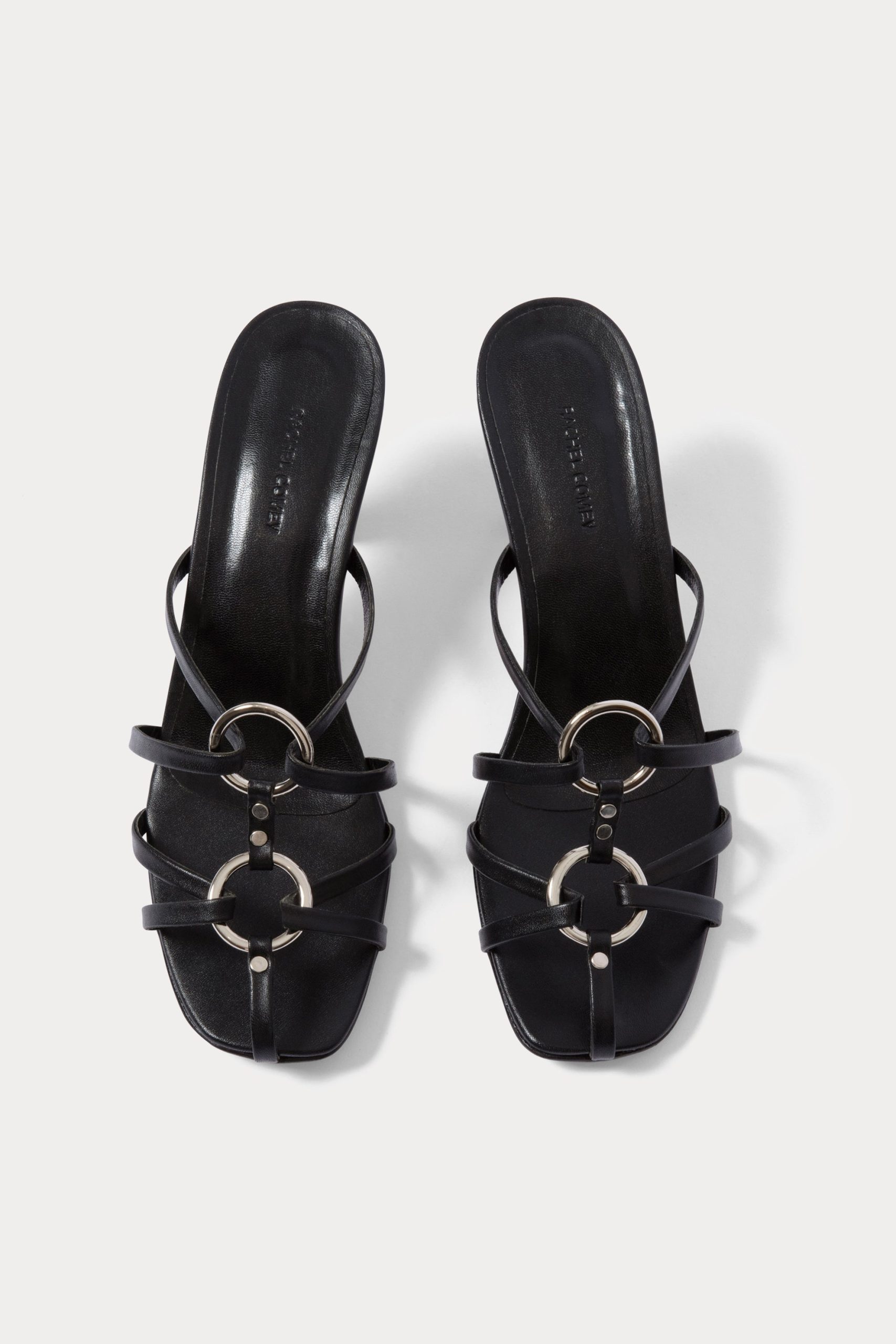 Bondage-inspired kitten sandals with an open toe design in soft nappa leather. Features interlocking metal ring details at the vamp.