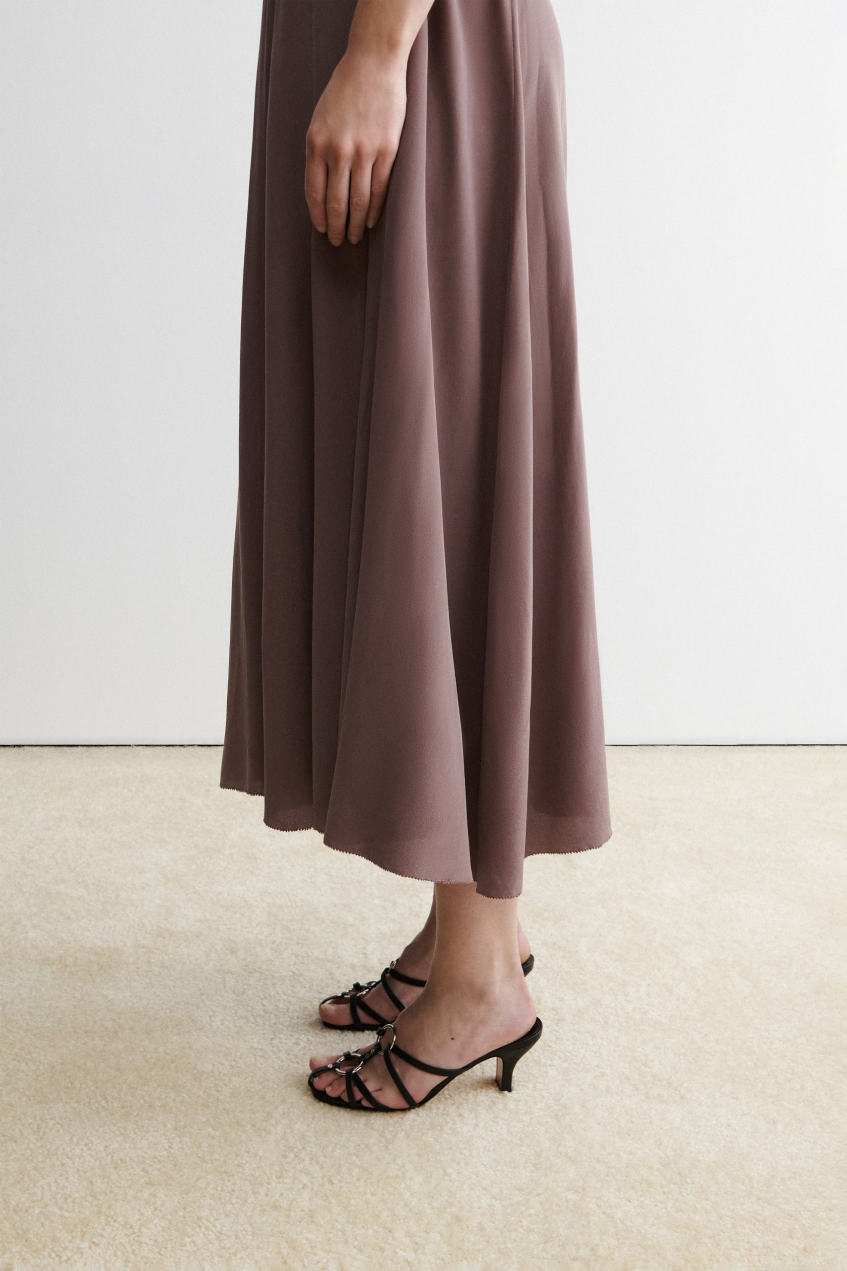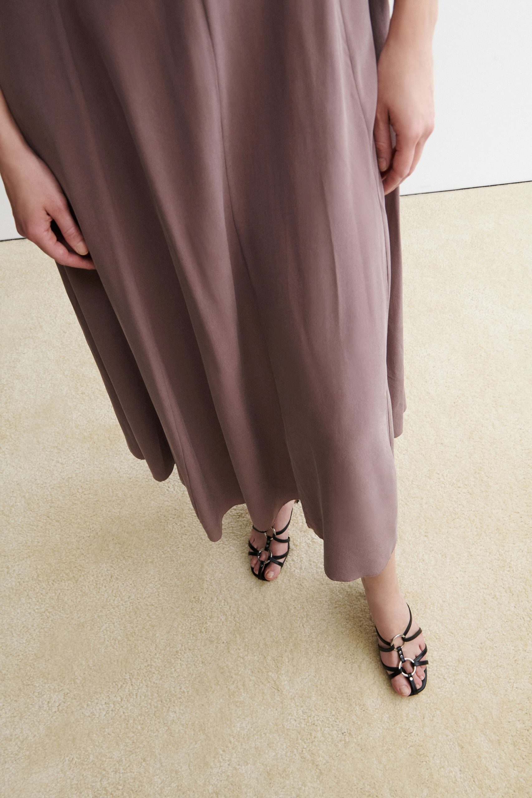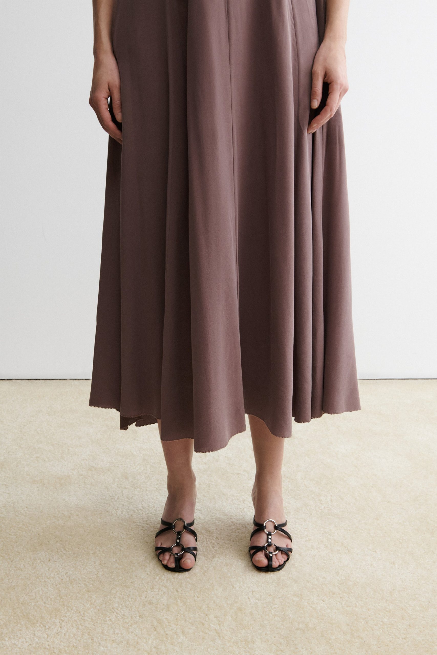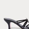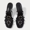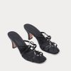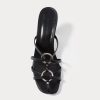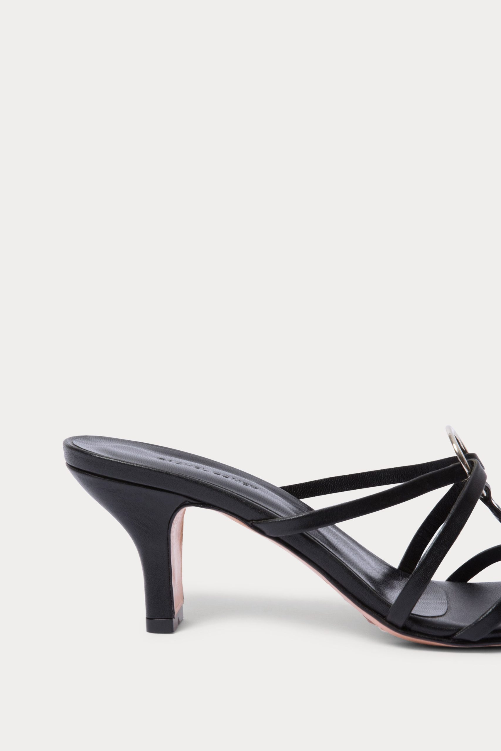 Bondage-inspired kitten sandals with an open toe design in soft nappa leather. Features interlocking metal ring details at the vamp.