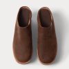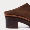 Platform leather clog with a distinctive tri-tone design and carved wood heel. Features a rubber sole for added comfort.
