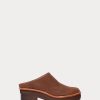 Platform leather clog with a distinctive tri-tone design and carved wood heel. Features a rubber sole for added comfort.
