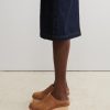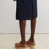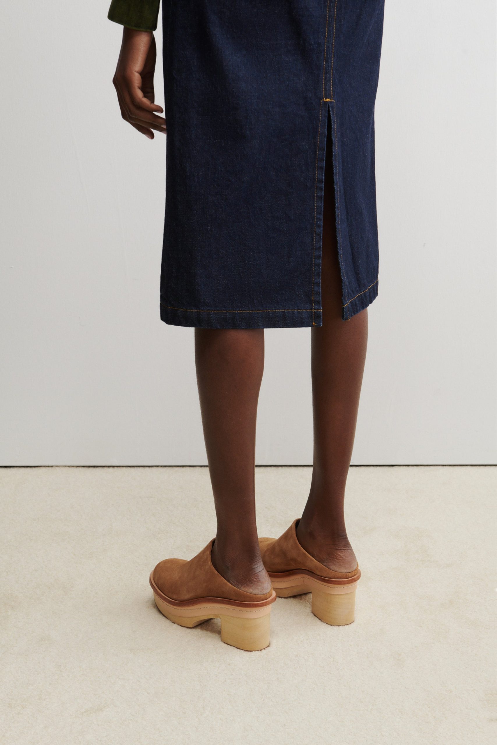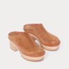 Platform suede leather clog with a distinctive tri-tone design and carved wood heel. Features a rubber sole for added comfort.