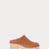 Platform suede leather clog with a distinctive tri-tone design and carved wood heel. Features a rubber sole for added comfort.