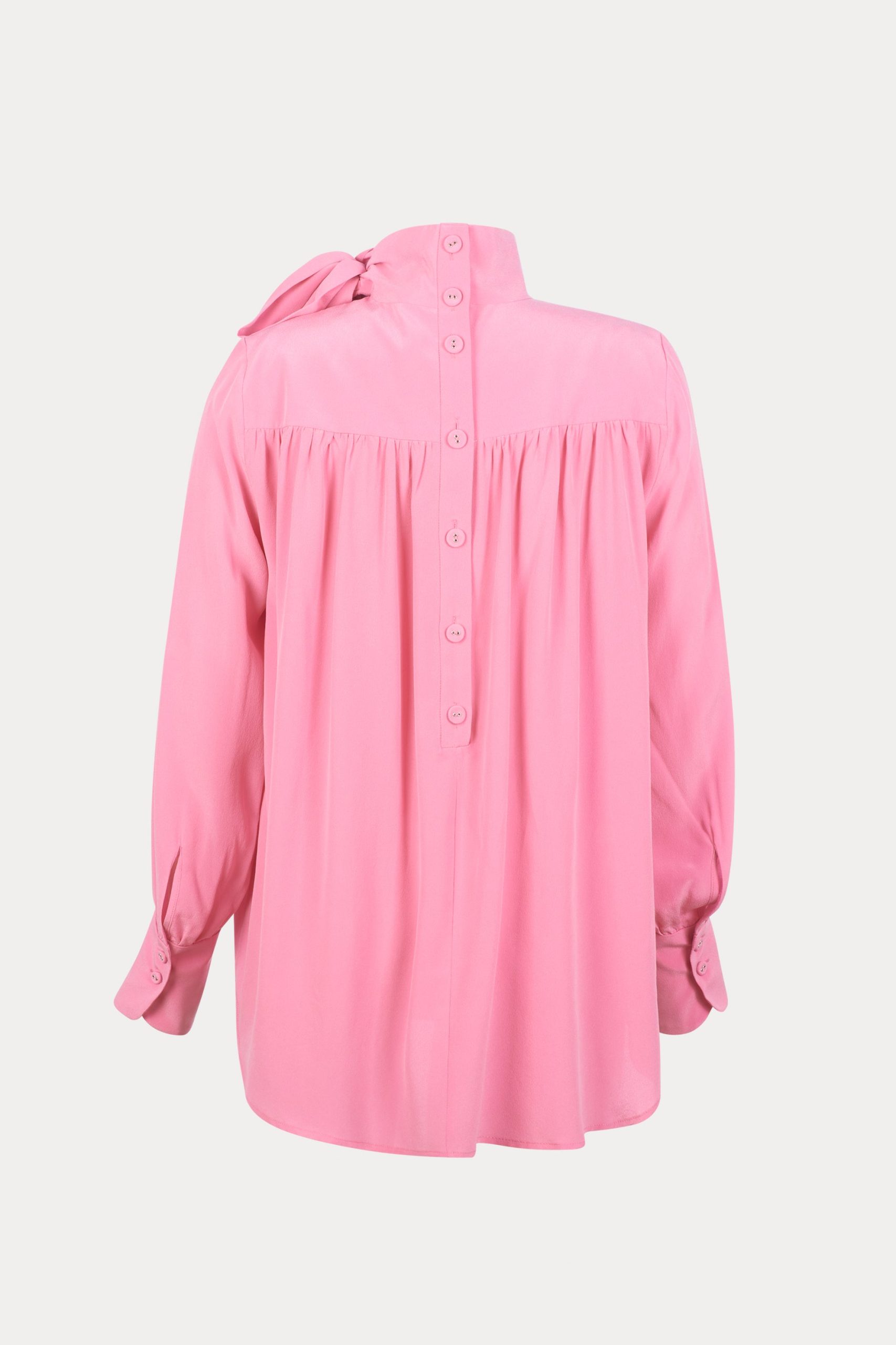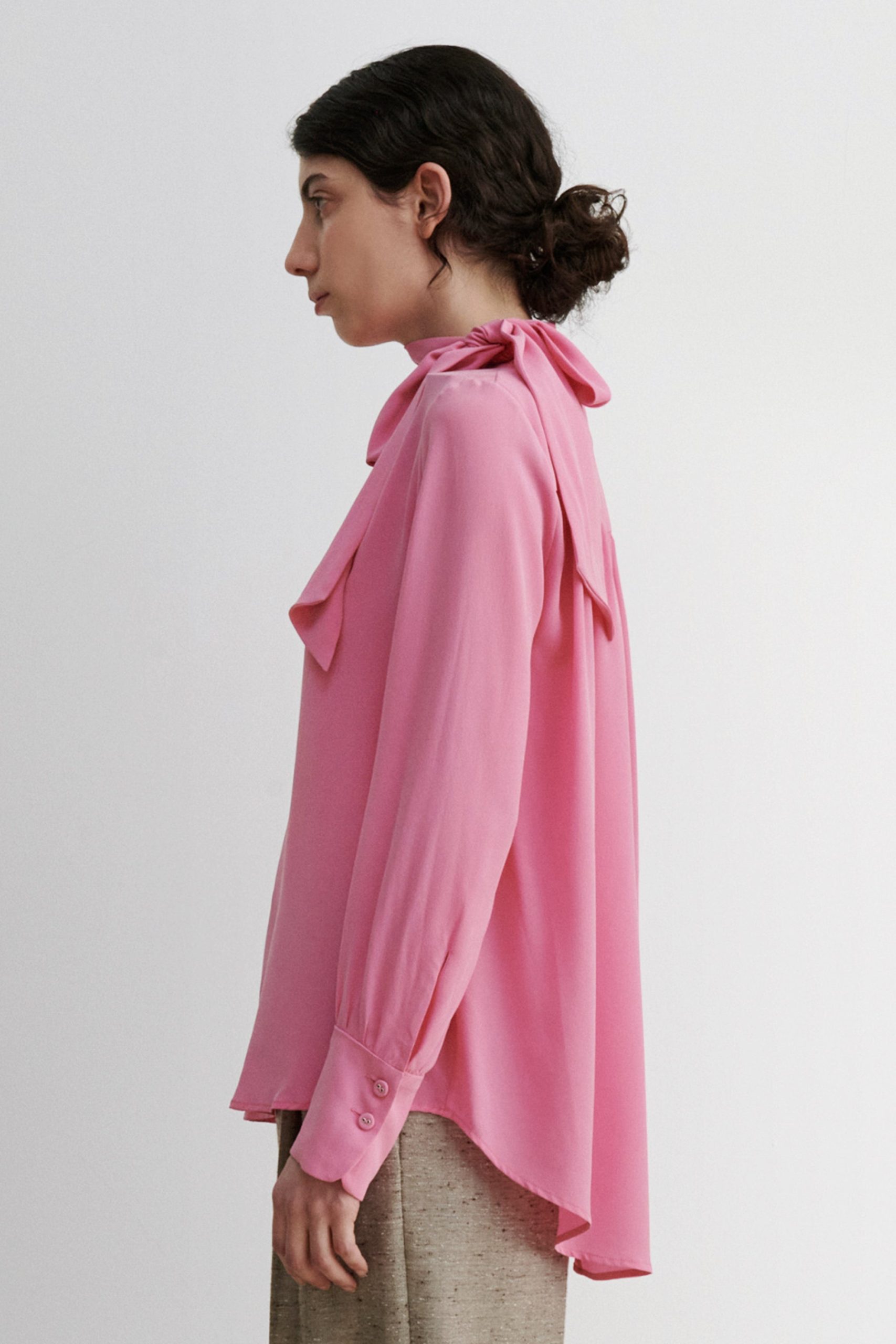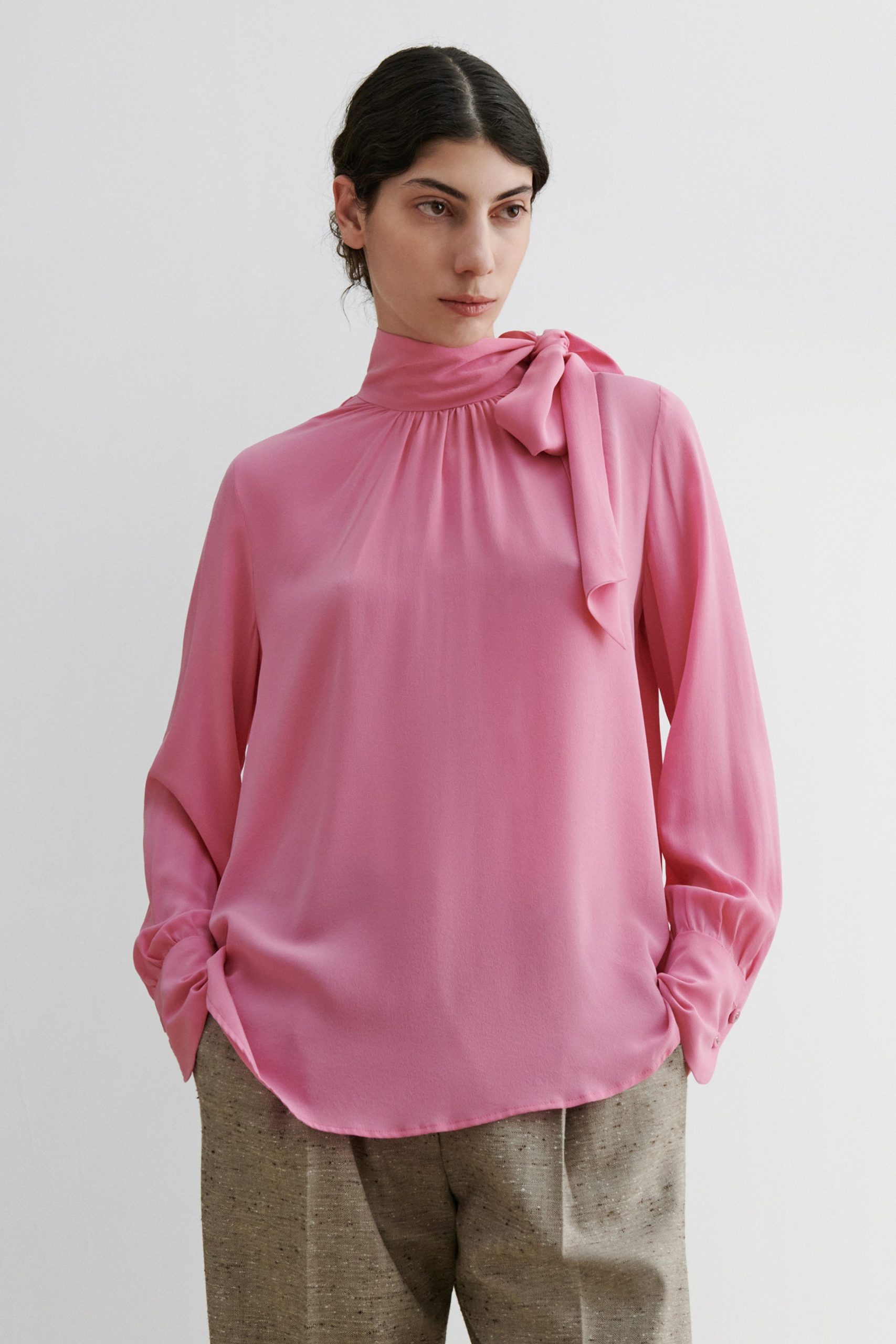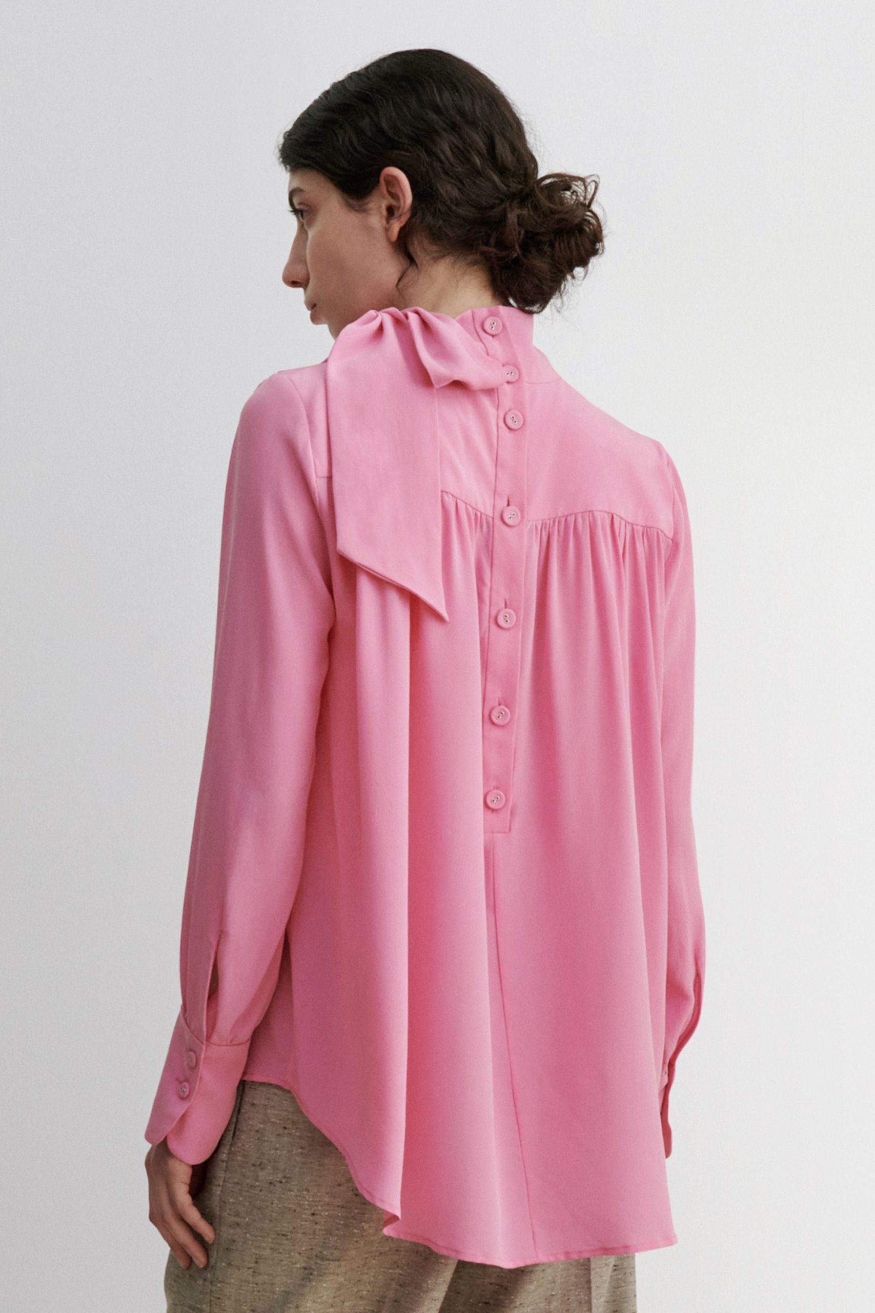 Mock-neck blouse with an attached tie at the neckline, cut from sandwashed silk. Designed with long sleeves, buttoned cuffs, and back button detailing. Perfect for a holiday party.