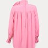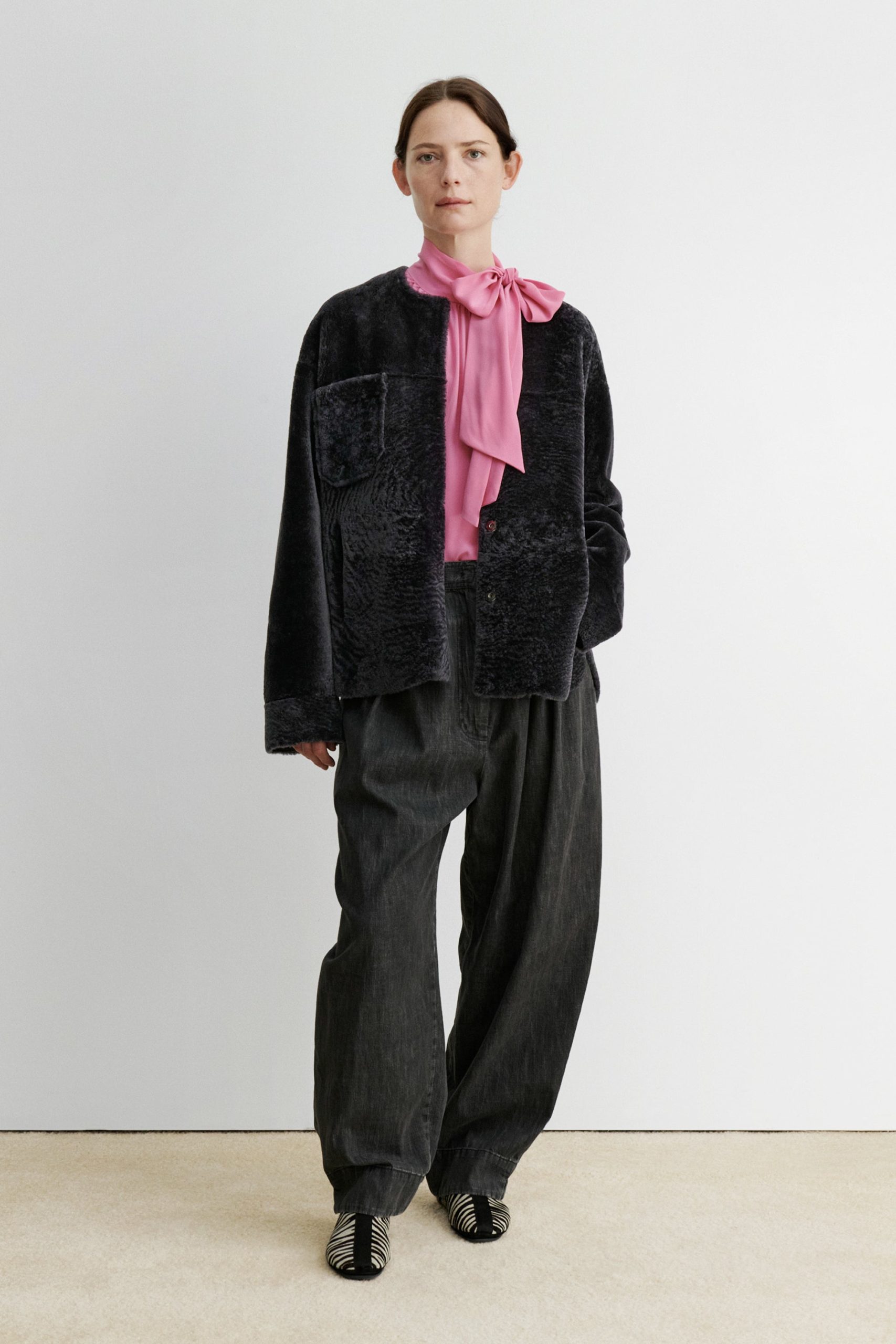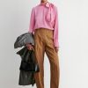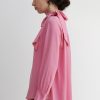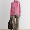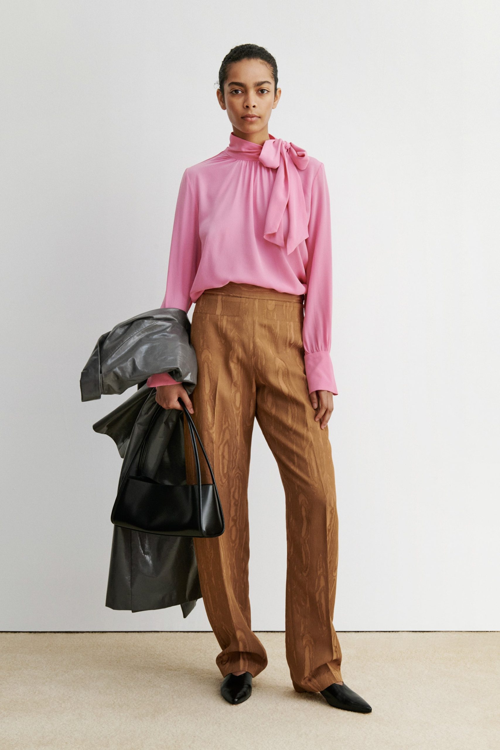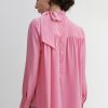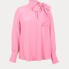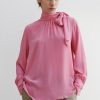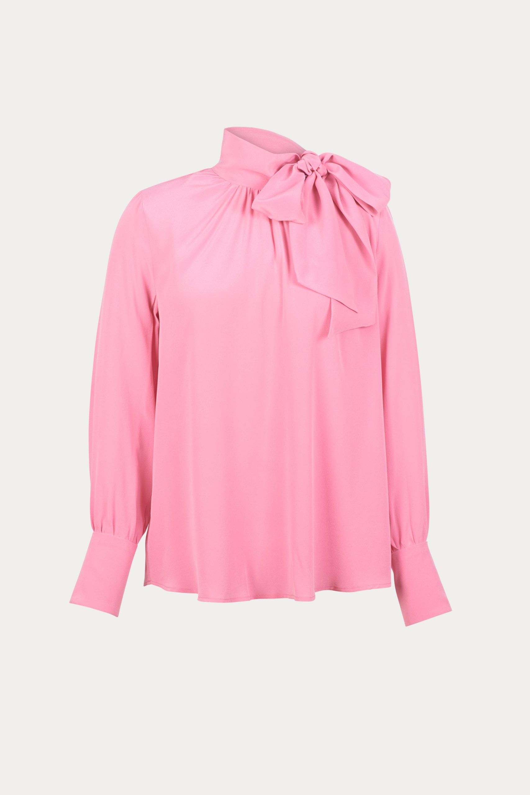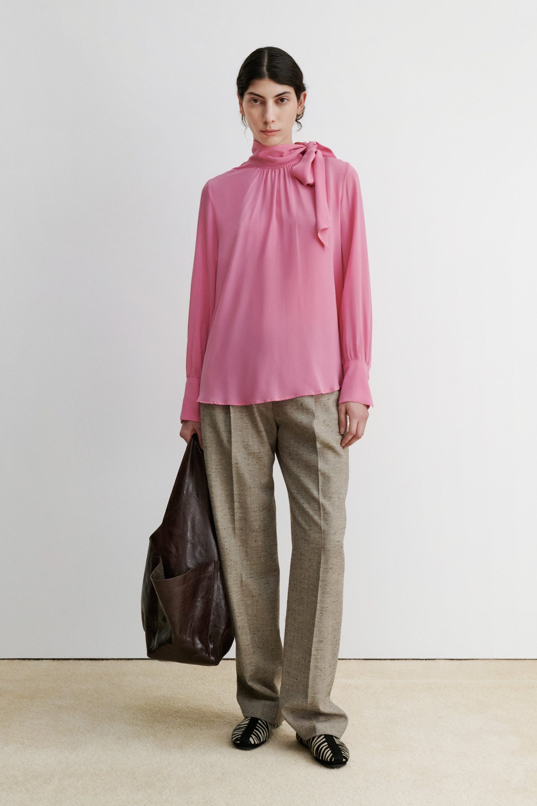 Mock-neck blouse with an attached tie at the neckline, cut from sandwashed silk. Designed with long sleeves, buttoned cuffs, and back button detailing. Perfect for a holiday party.