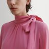 Mock-neck blouse with an attached tie at the neckline, cut from sandwashed silk. Designed with long sleeves, buttoned cuffs, and back button detailing. Perfect for a holiday party.