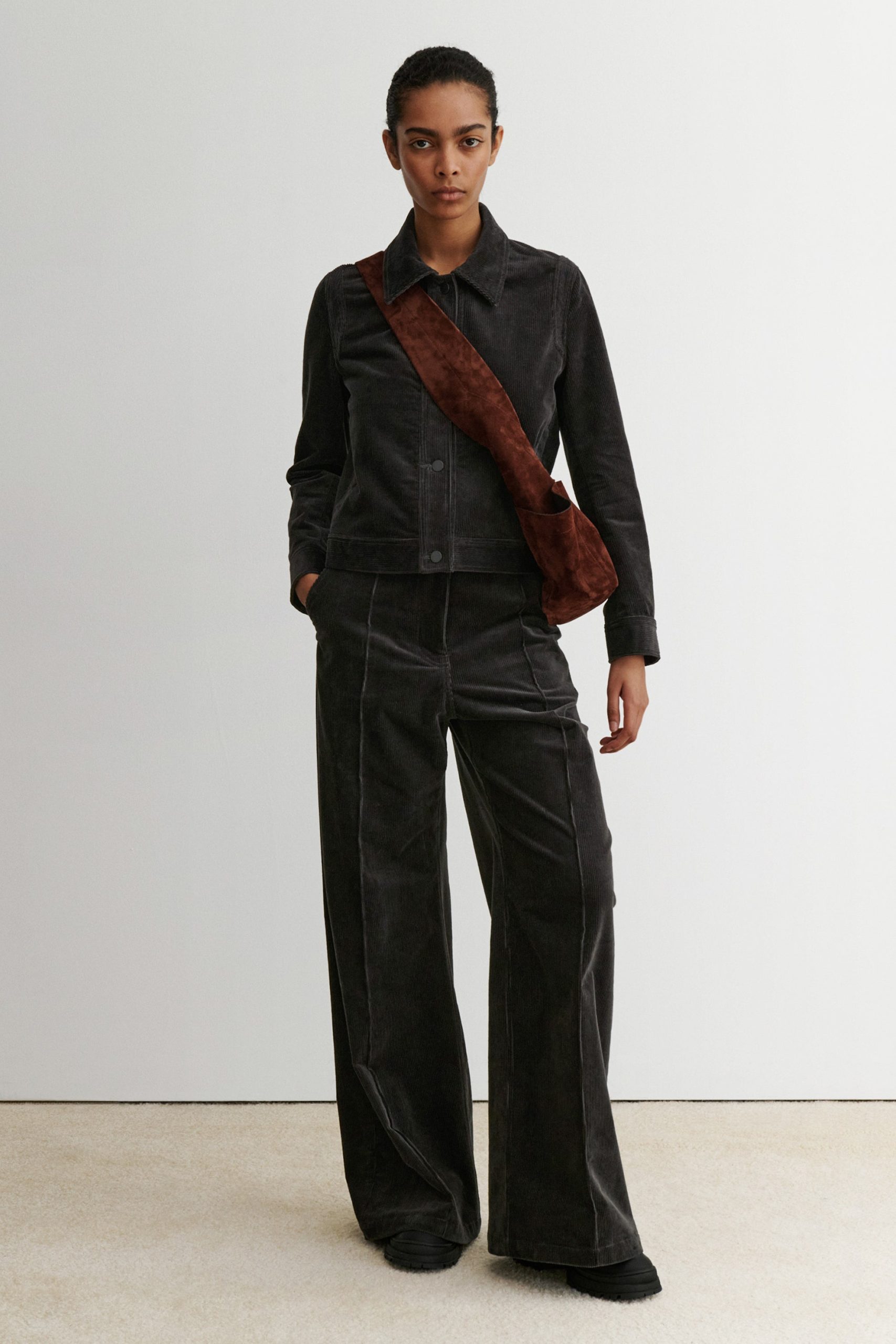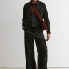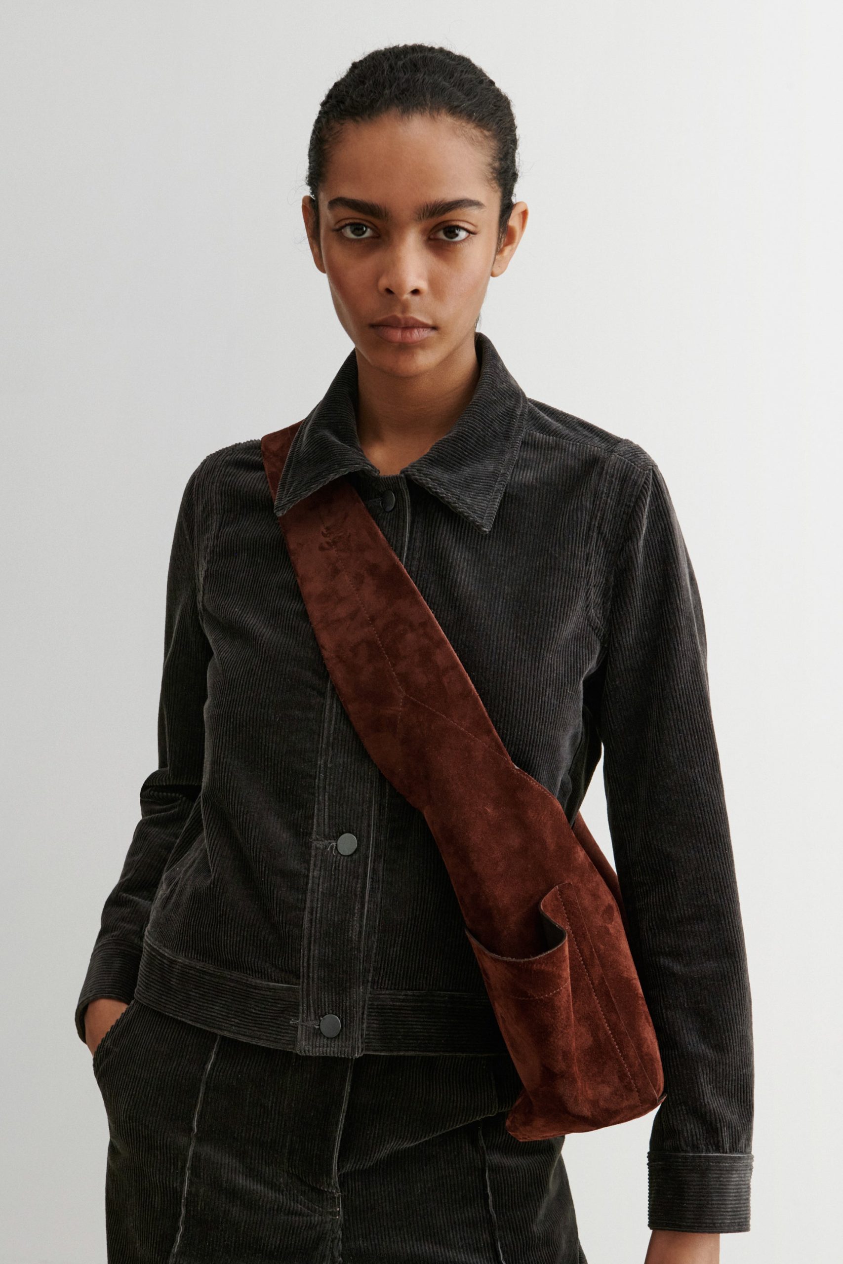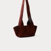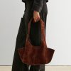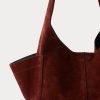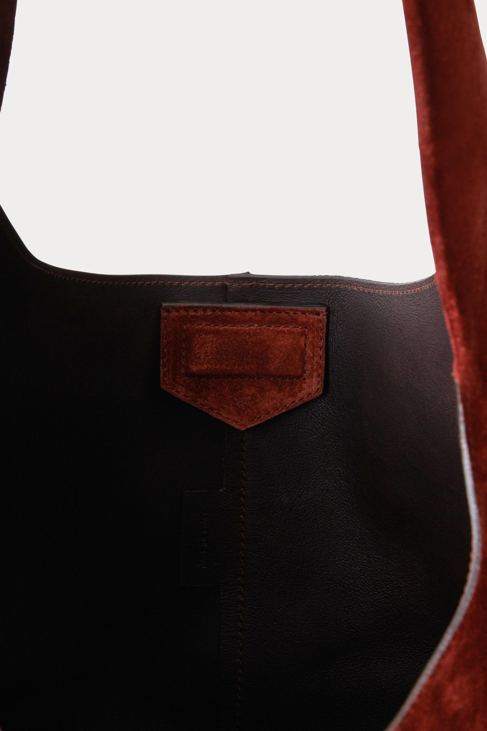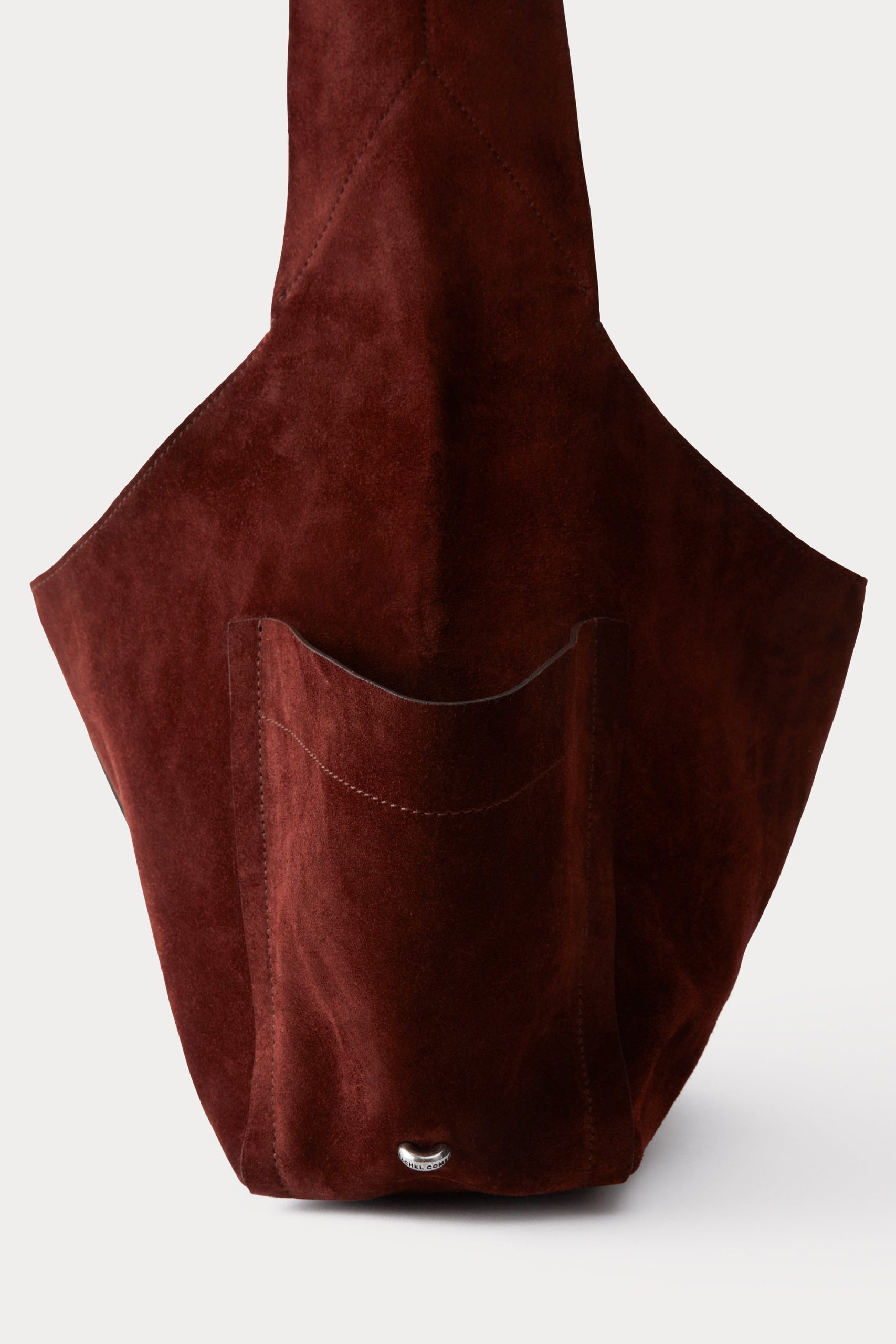 Soft and sculptural, this semi-structured bag in rich bonded suede features a fixed shoulder strap, extended exterior pockets, and magnetic closure. Can be worn over the shoulder or across the body. A smaller version of our Large Tool Bag.