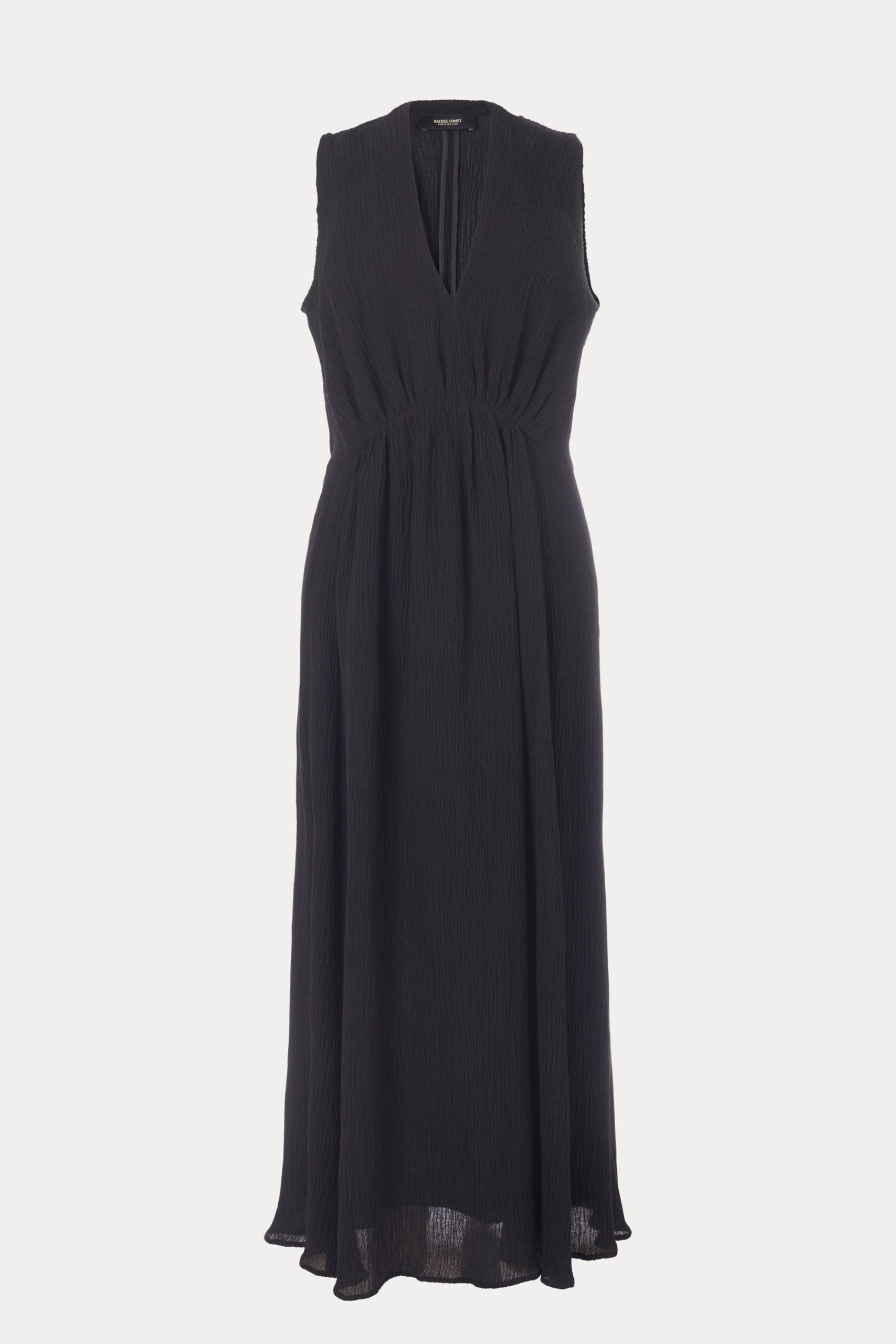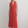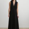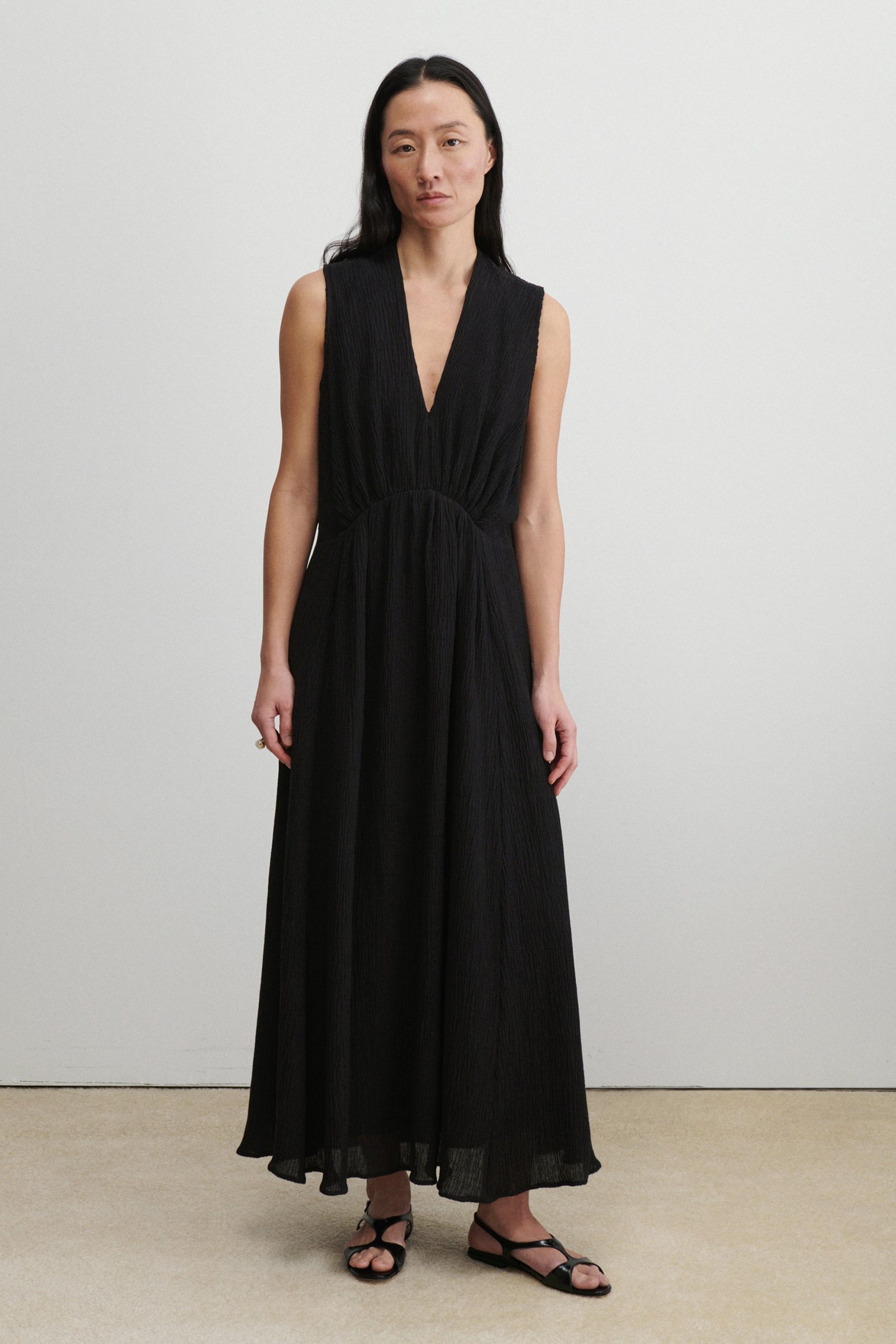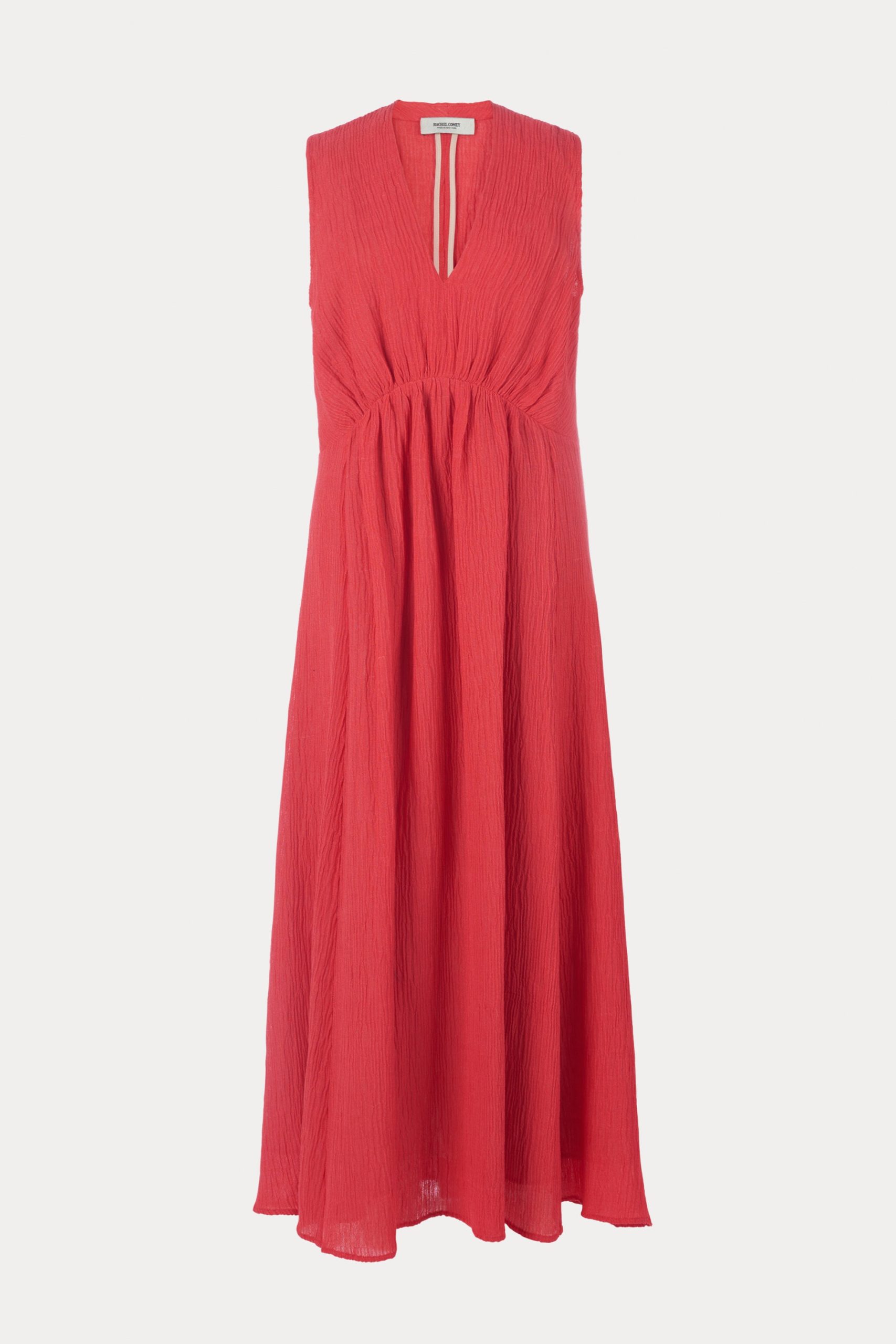 Sleeveless maxi dress cut from airy Ramie linen gauze, which has a lightweight and textured quality. Features a deep V-neckline, a cinched waist with gathered detailing, and a full, fluid skirt.