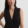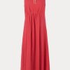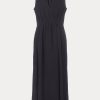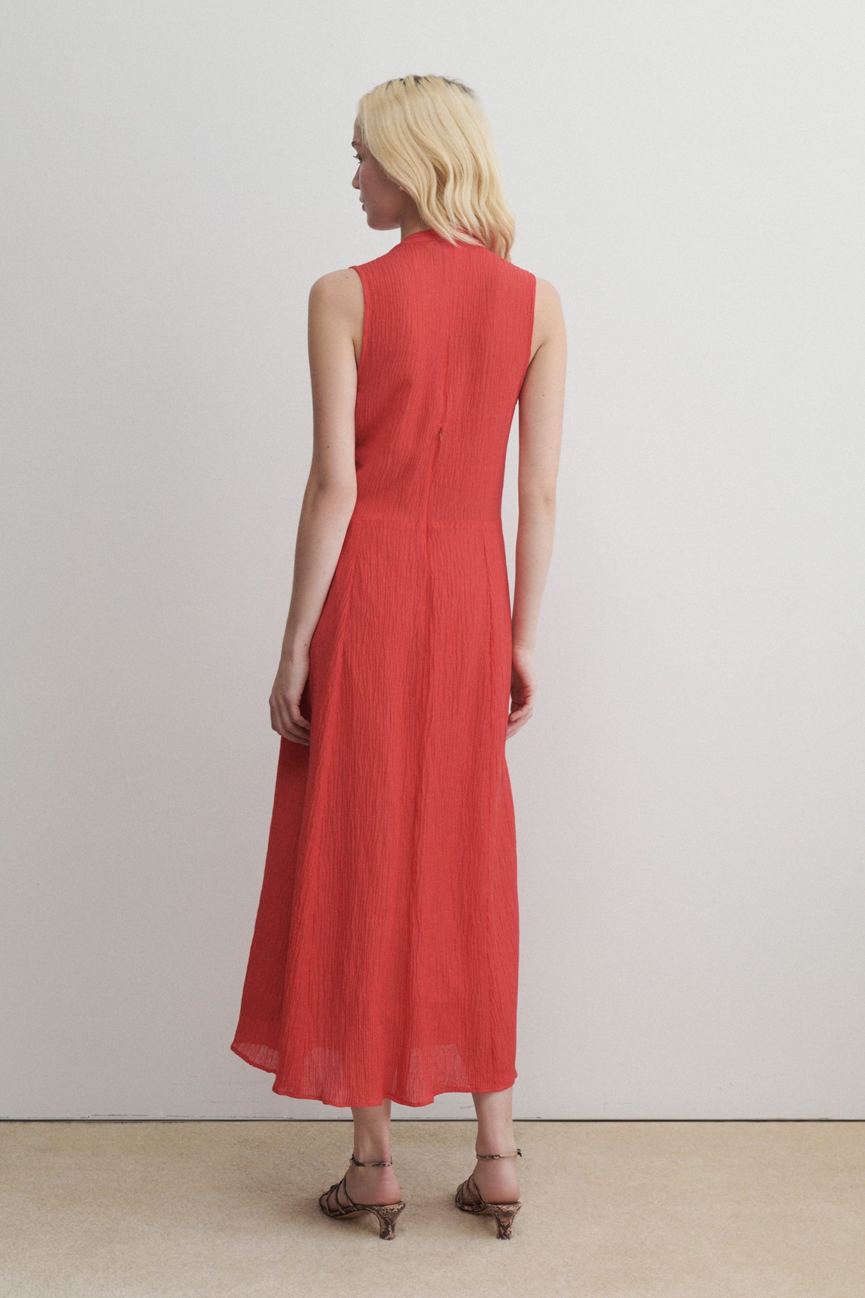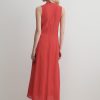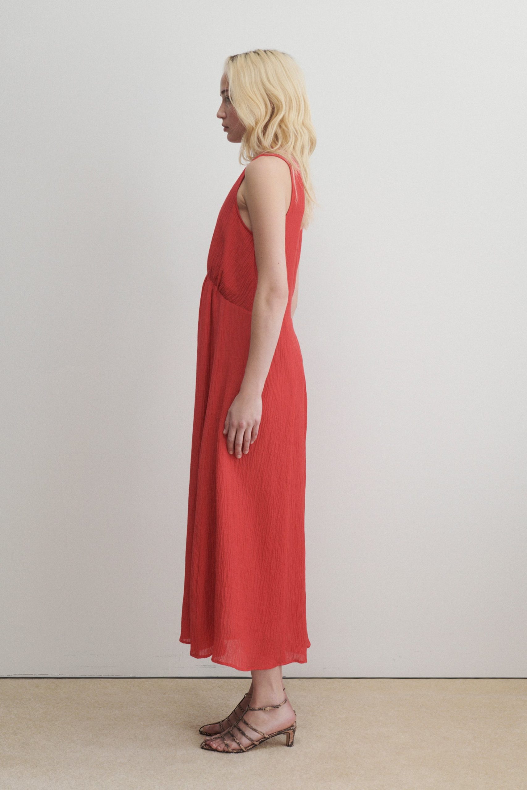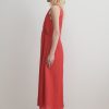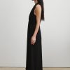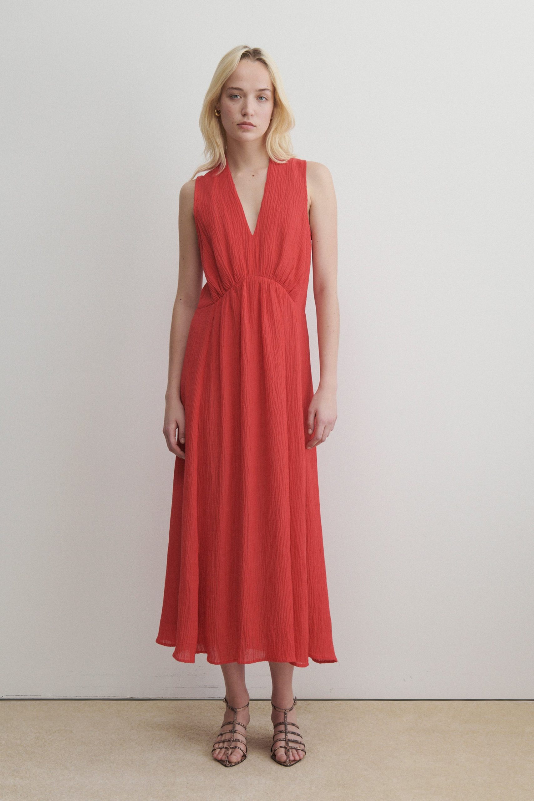 Sleeveless maxi dress cut from airy Ramie linen gauze, which has a lightweight and textured quality. Features a deep V-neckline, a cinched waist with gathered detailing, and a full, fluid skirt.
