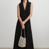 Sleeveless maxi dress cut from airy Ramie linen gauze, which has a lightweight and textured quality. Features a deep V-neckline, a cinched waist with gathered detailing, and a full, fluid skirt.