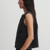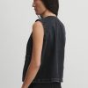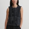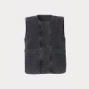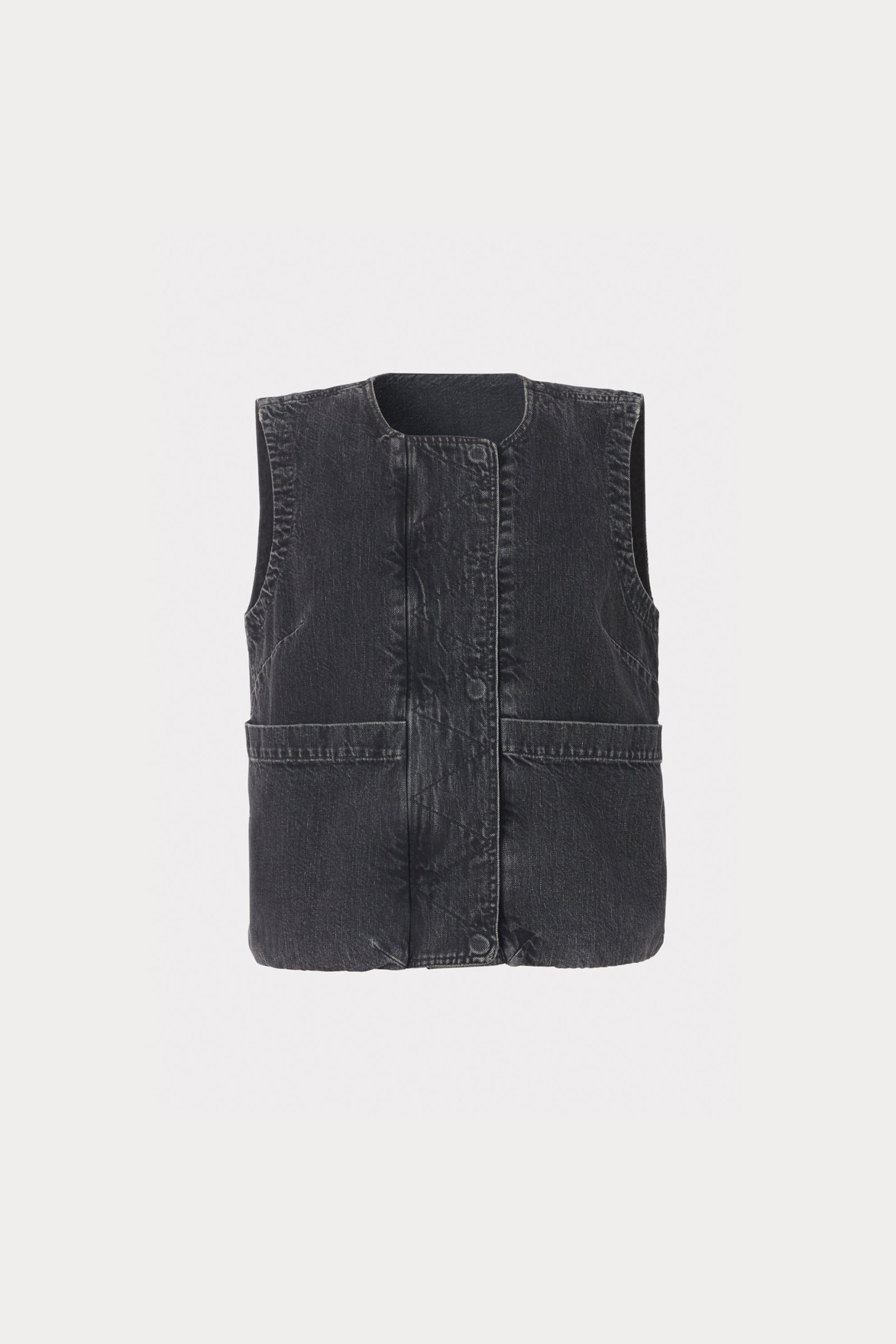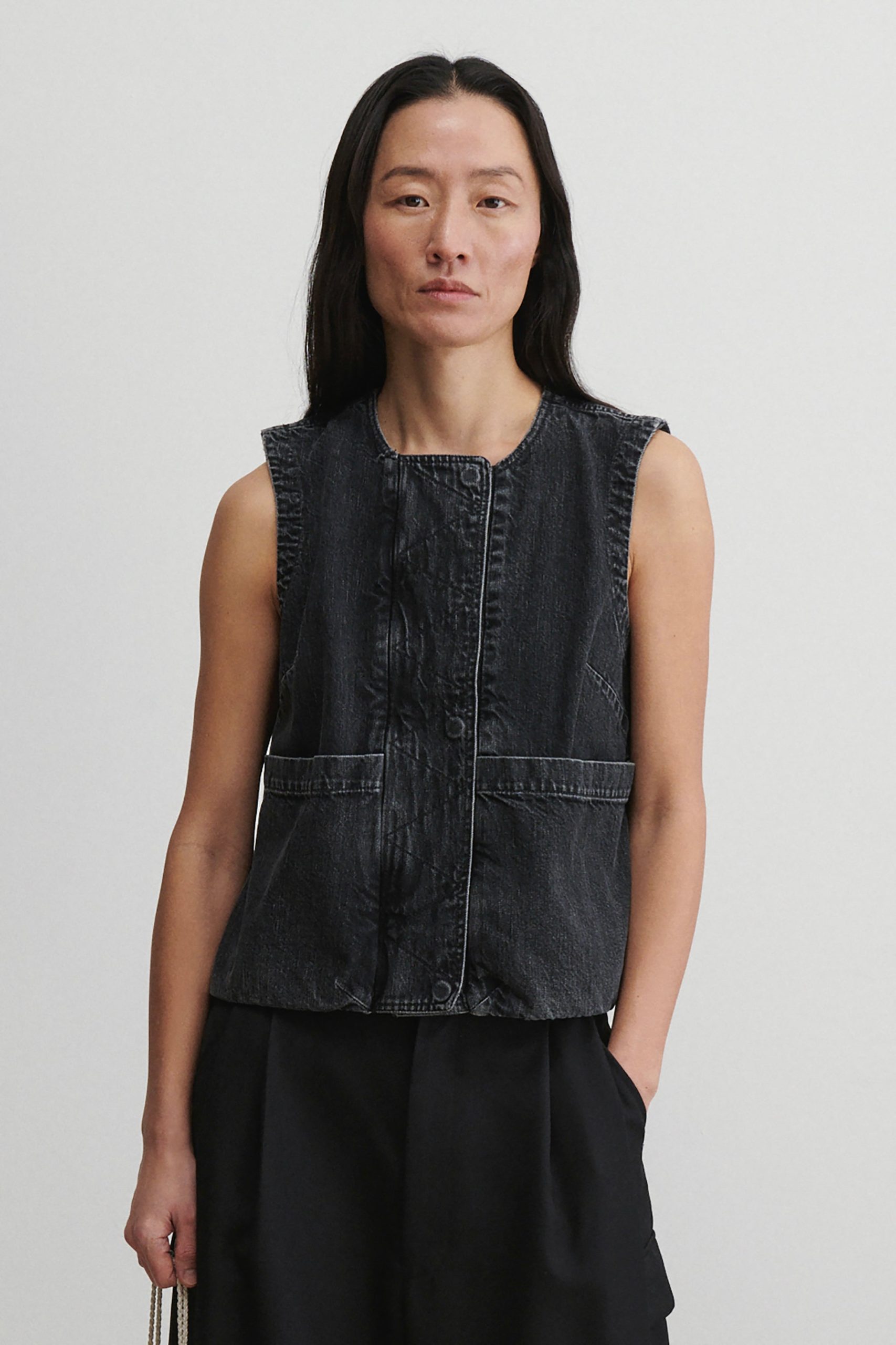 Sleeveless top cut from our washed Salinas Denim. Features a round neckline and a concealed front snap placket. Designed with two front patch pockets for utility and a versatile, boxy silhouette suitable for everyday wear.