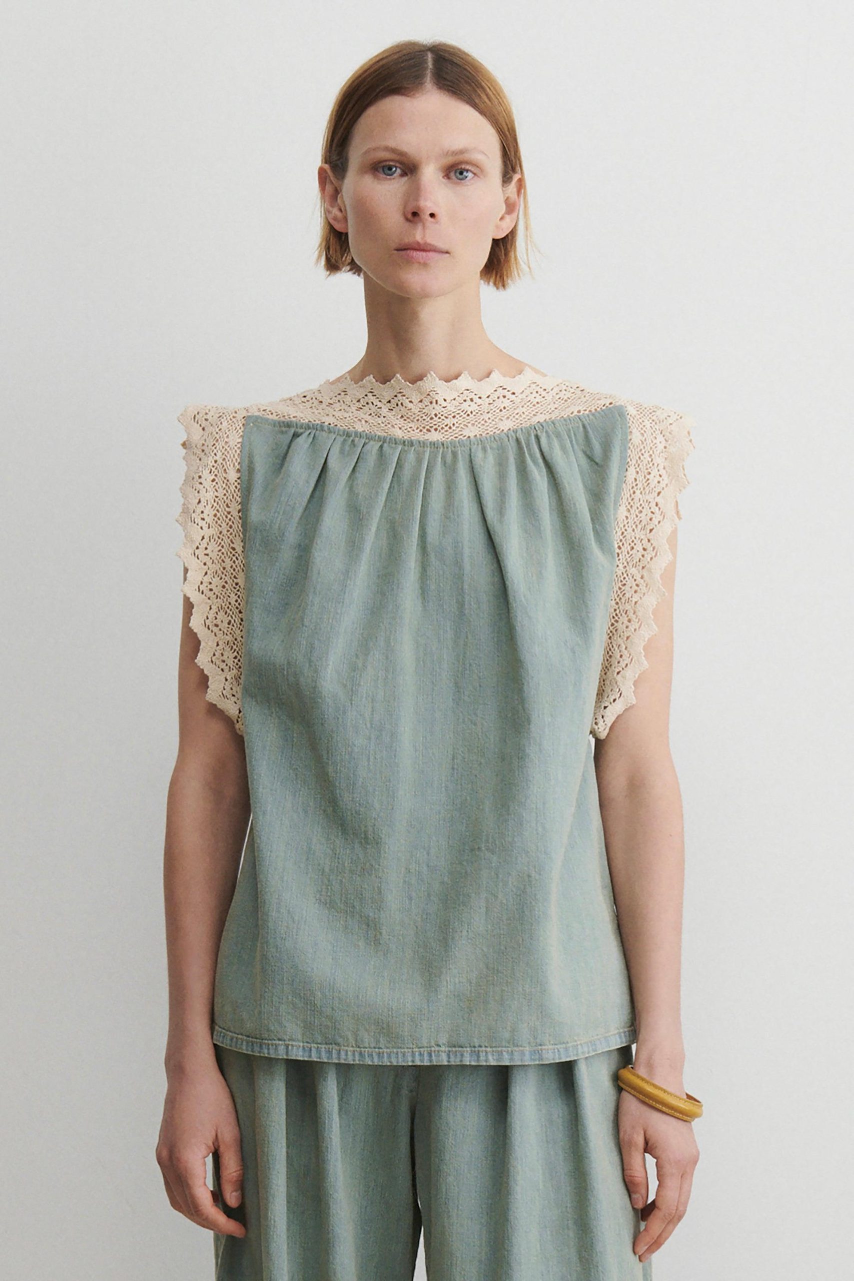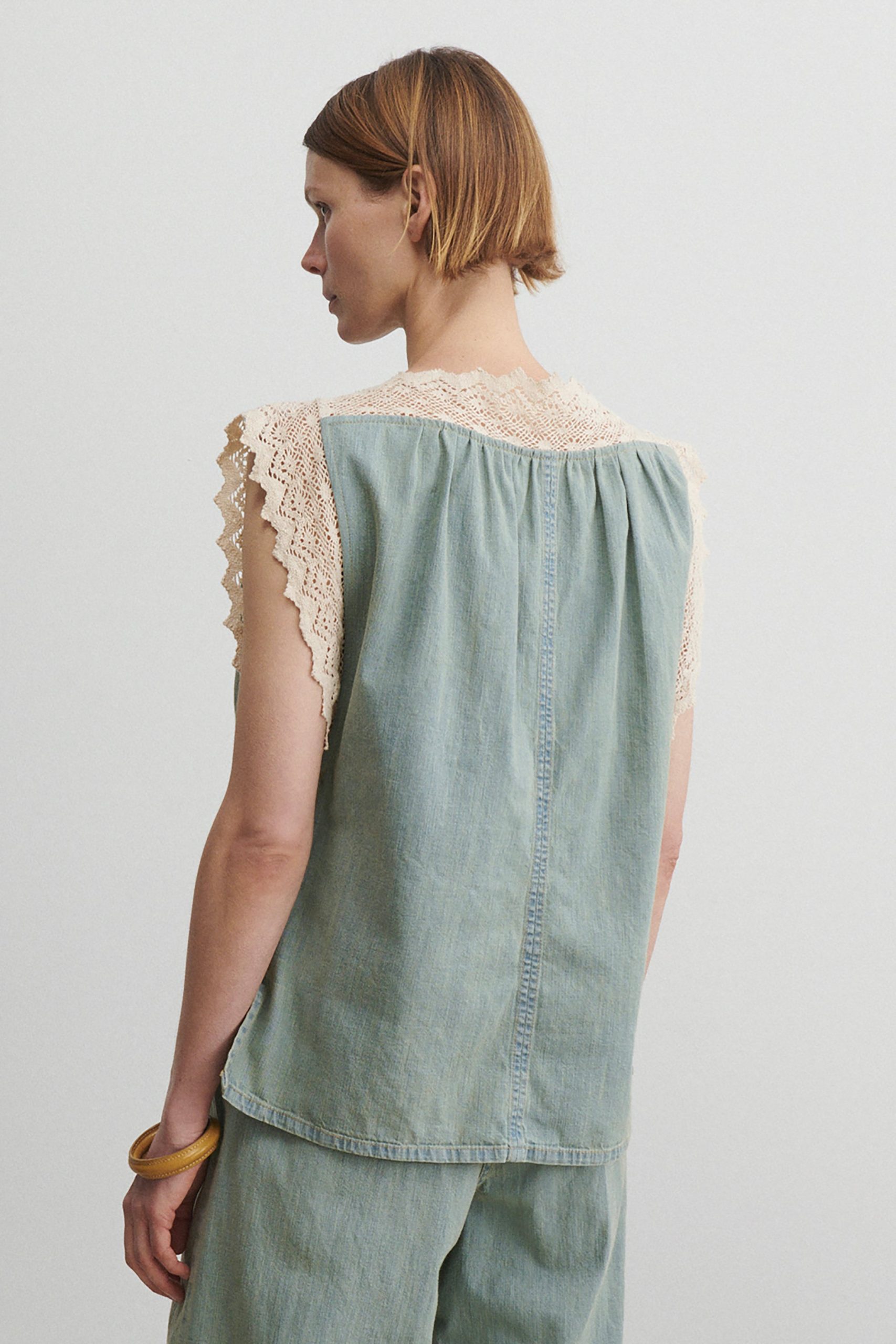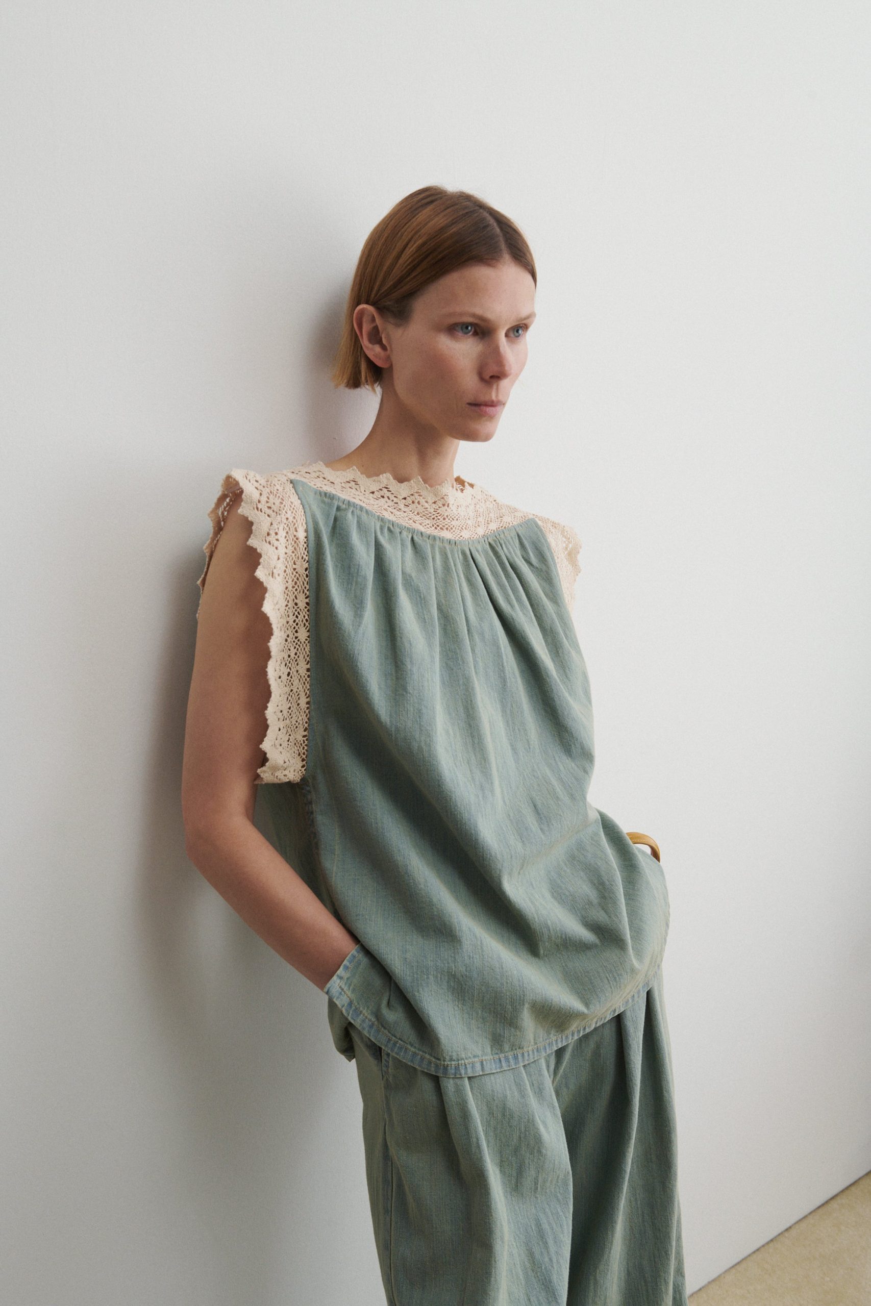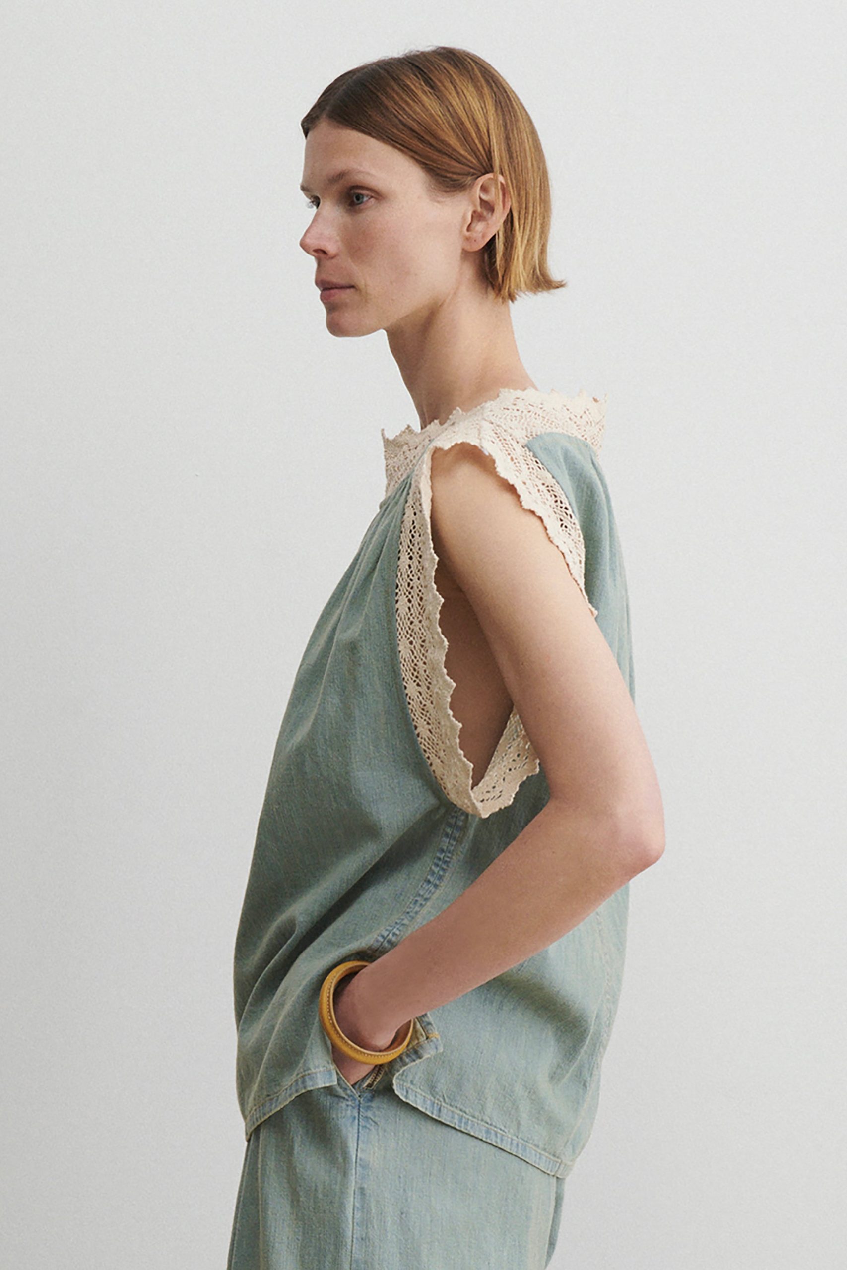 Sleeveless top cut from our Washed Vista Denim. Features a high-cut neckline and lace details. Features a relaxed silhouette suitable for everyday wear. Pair with our matching Coxsone Pant.