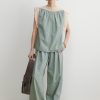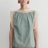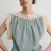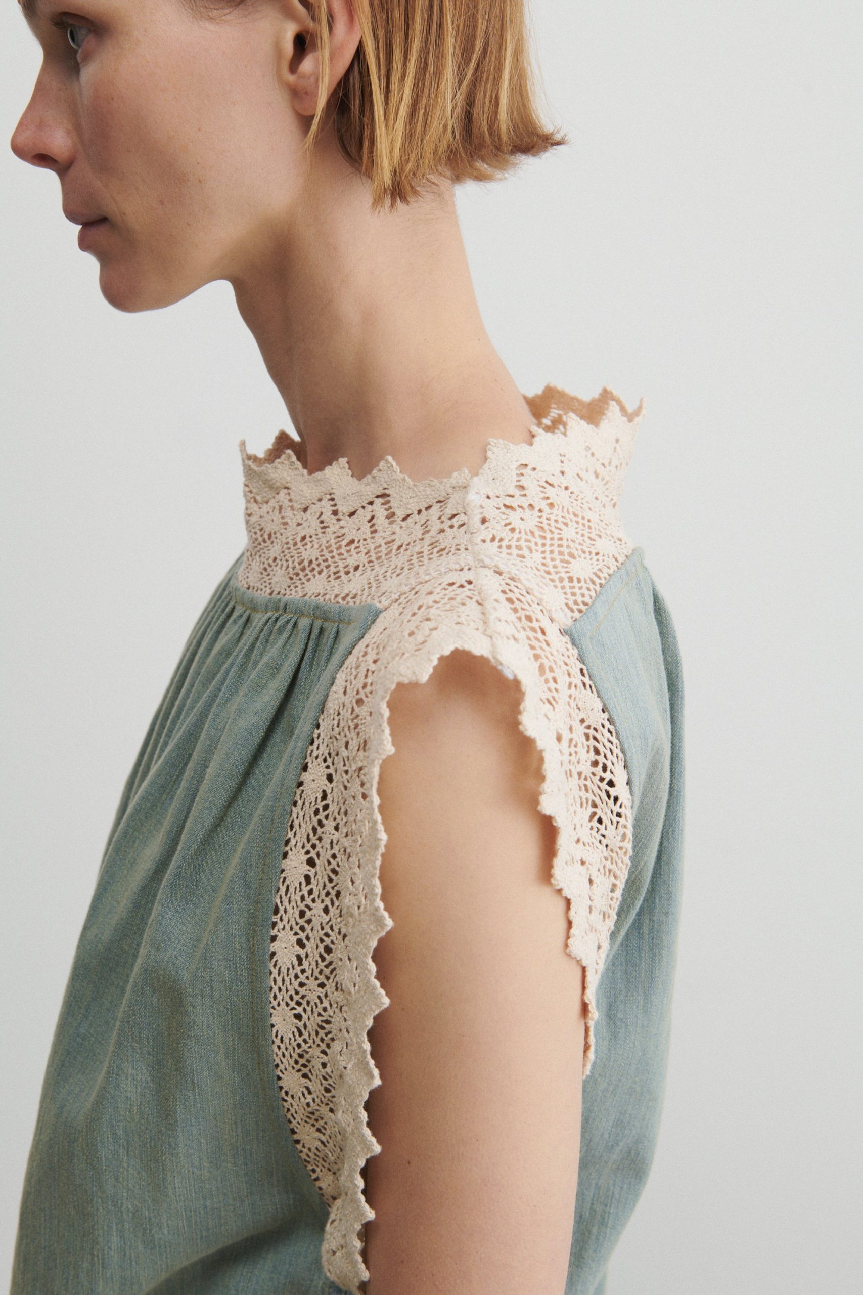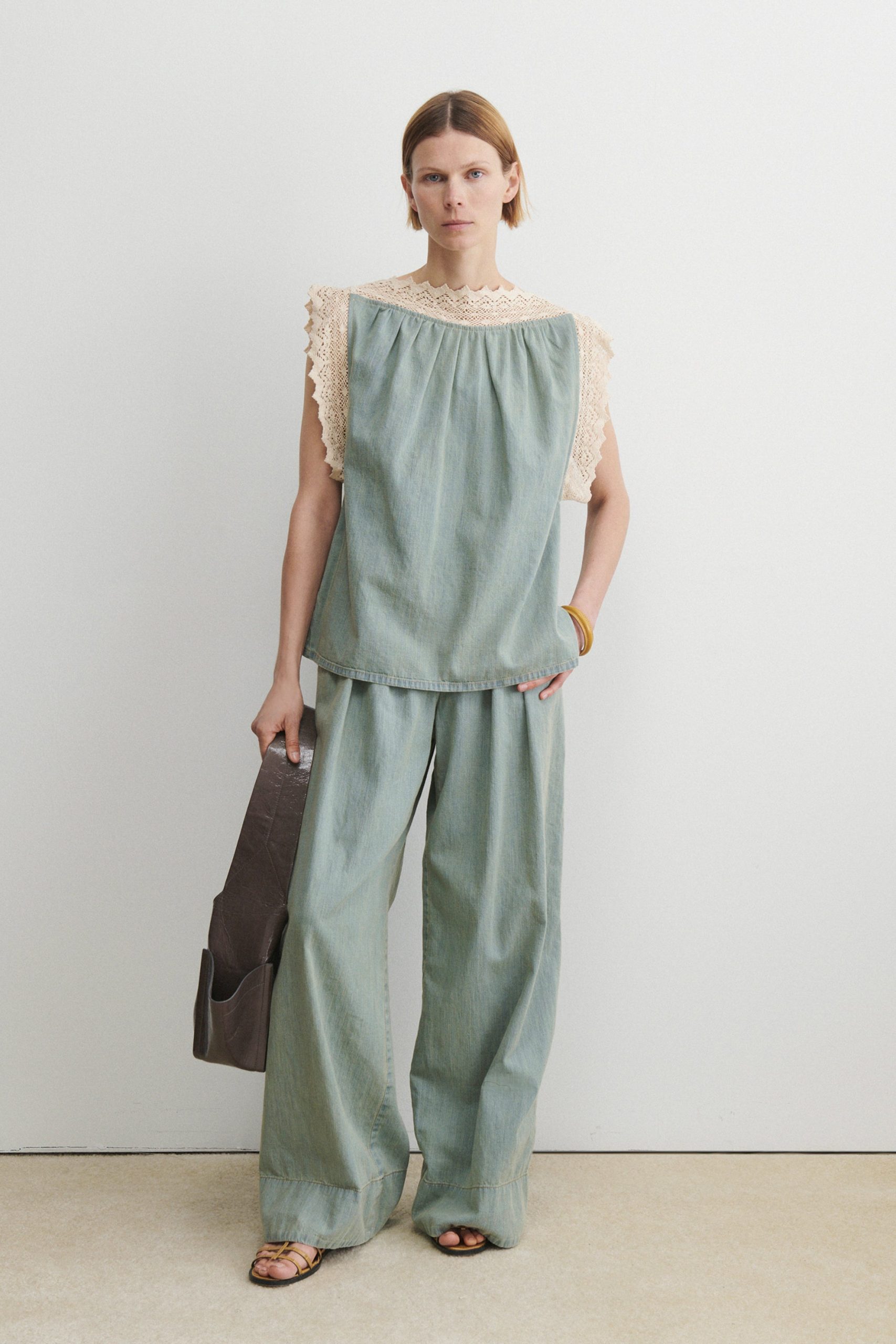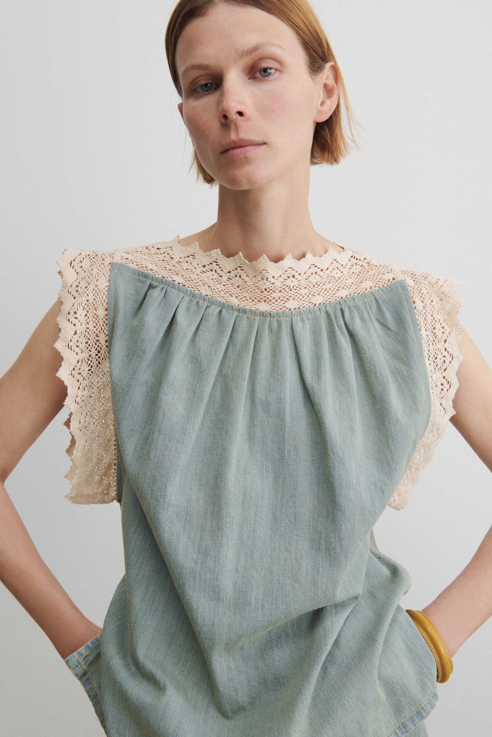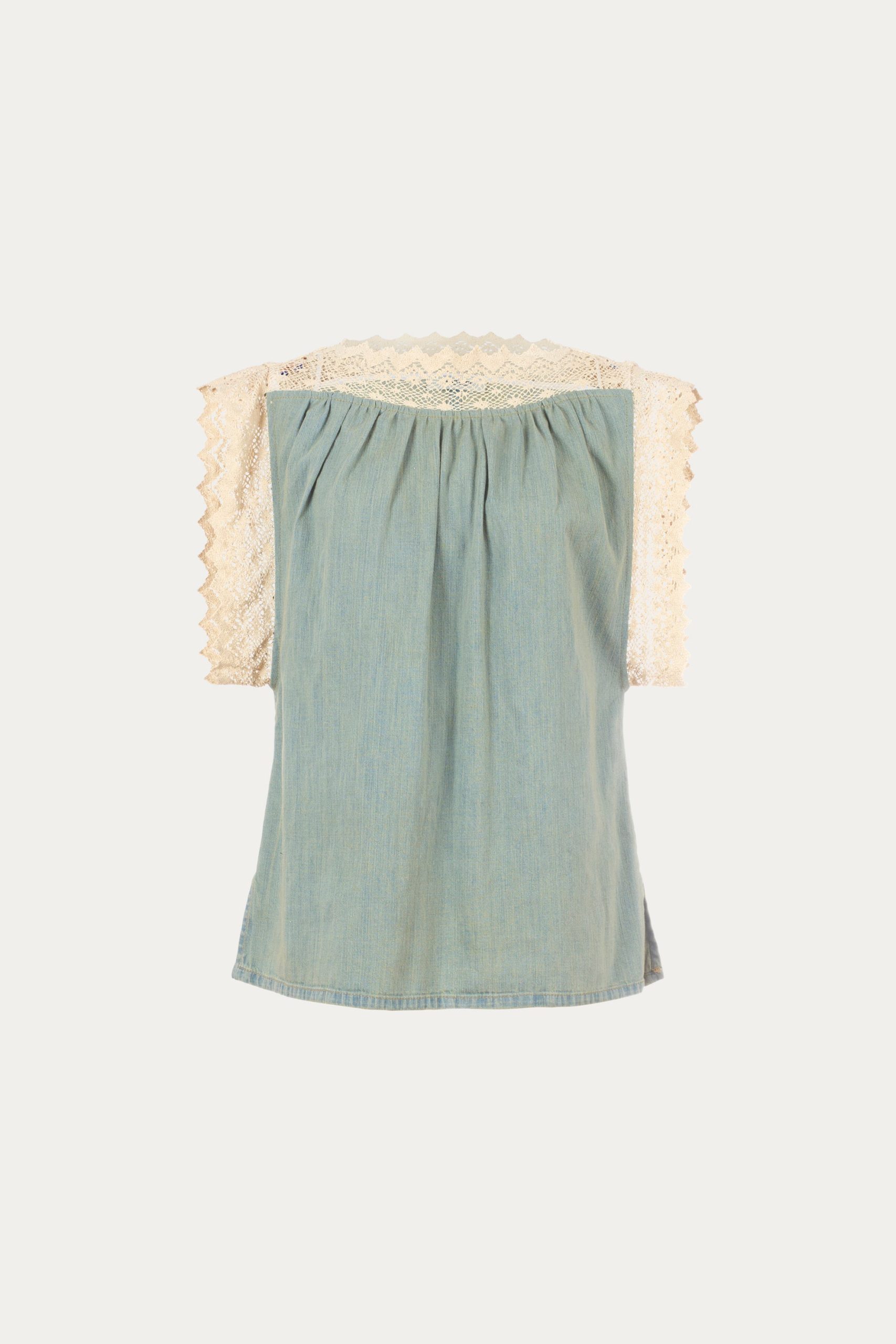 Sleeveless top cut from our Washed Vista Denim. Features a high-cut neckline and lace details. Features a relaxed silhouette suitable for everyday wear. Pair with our matching Coxsone Pant.