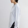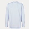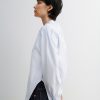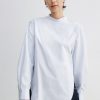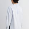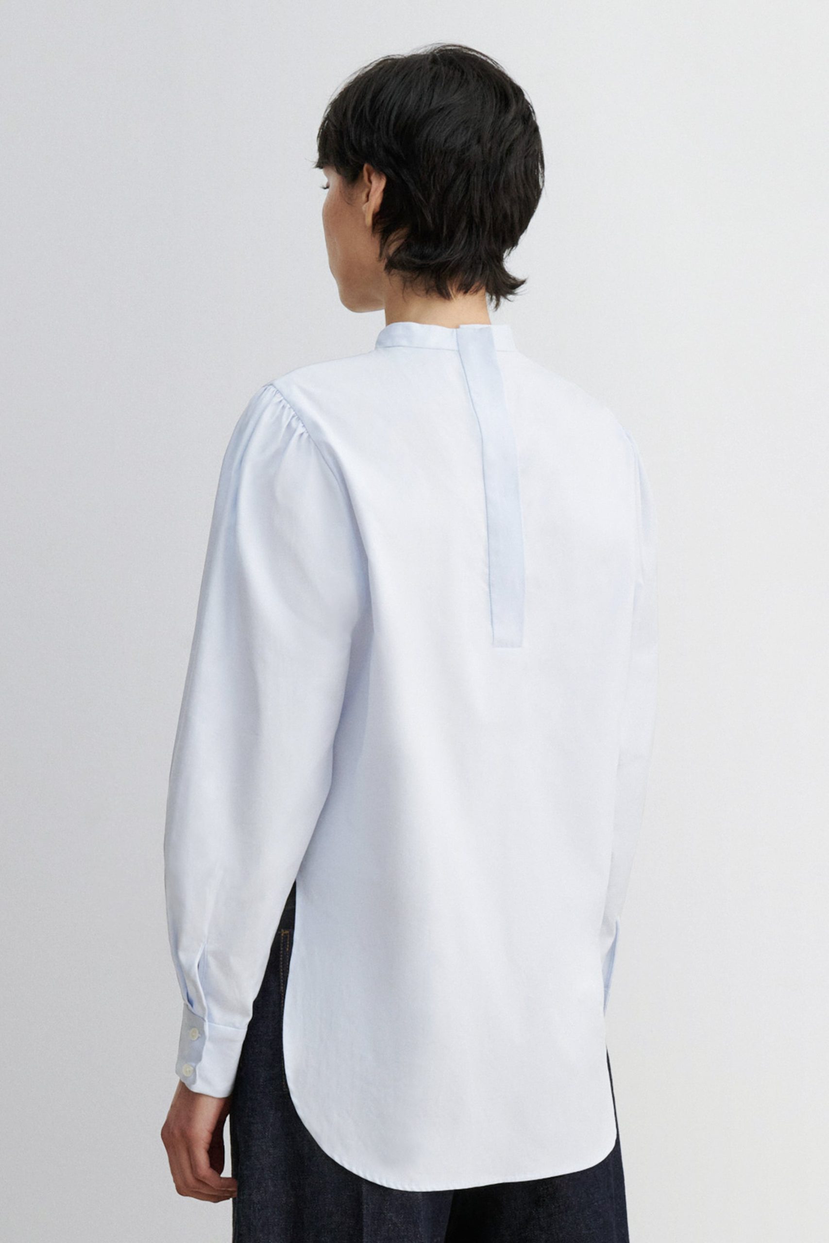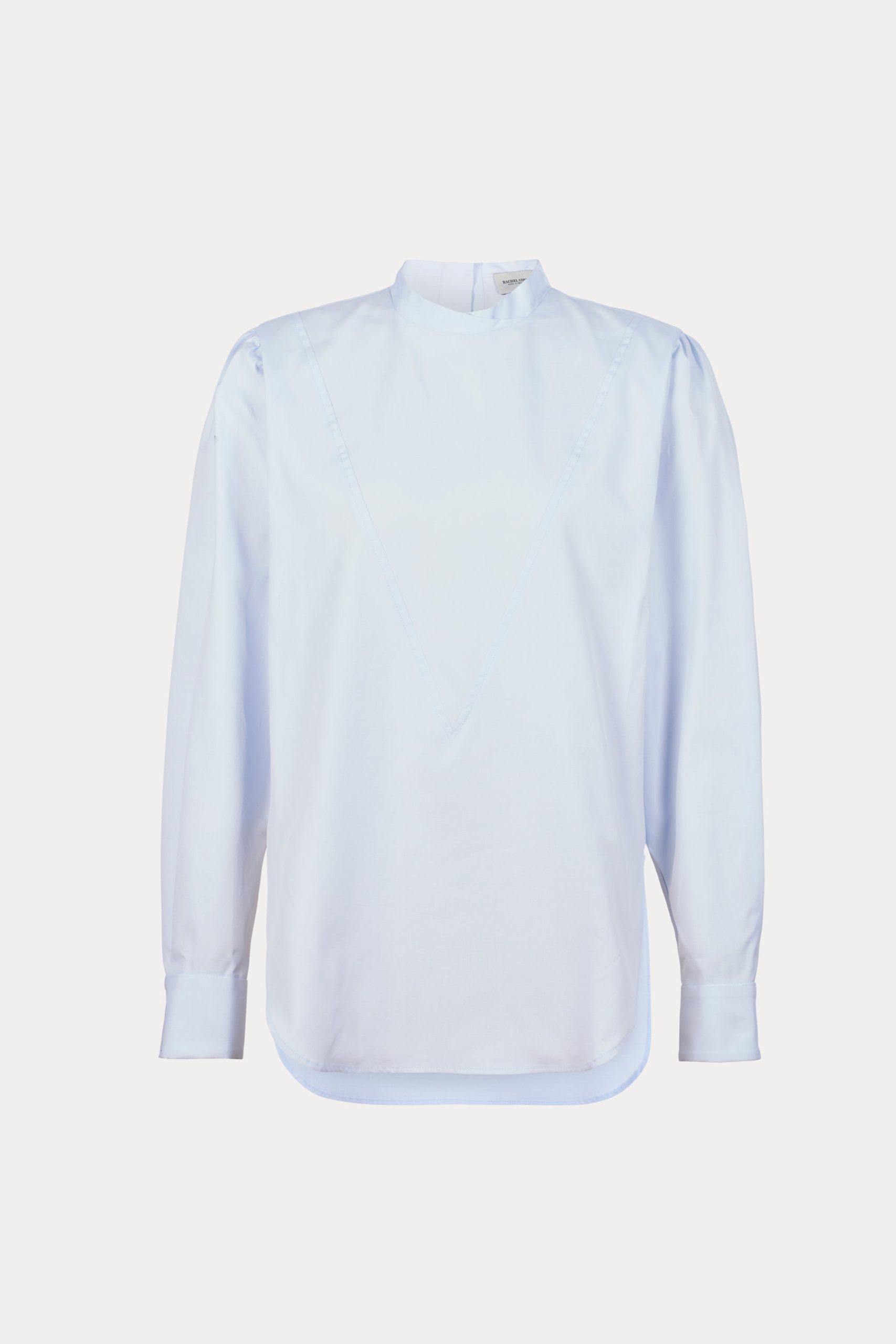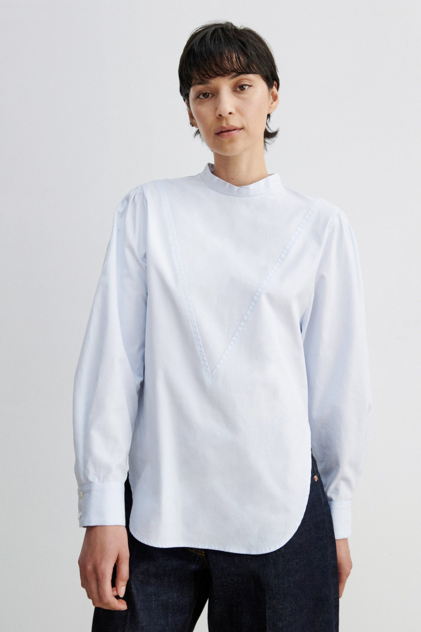 Long-sleeve mockneck top with a distinct V-shaped seam detail on the front, cut from crisp Oxford cotton. Features a puckered shoulder, concealed button closure at the back, and a graduated hemline.