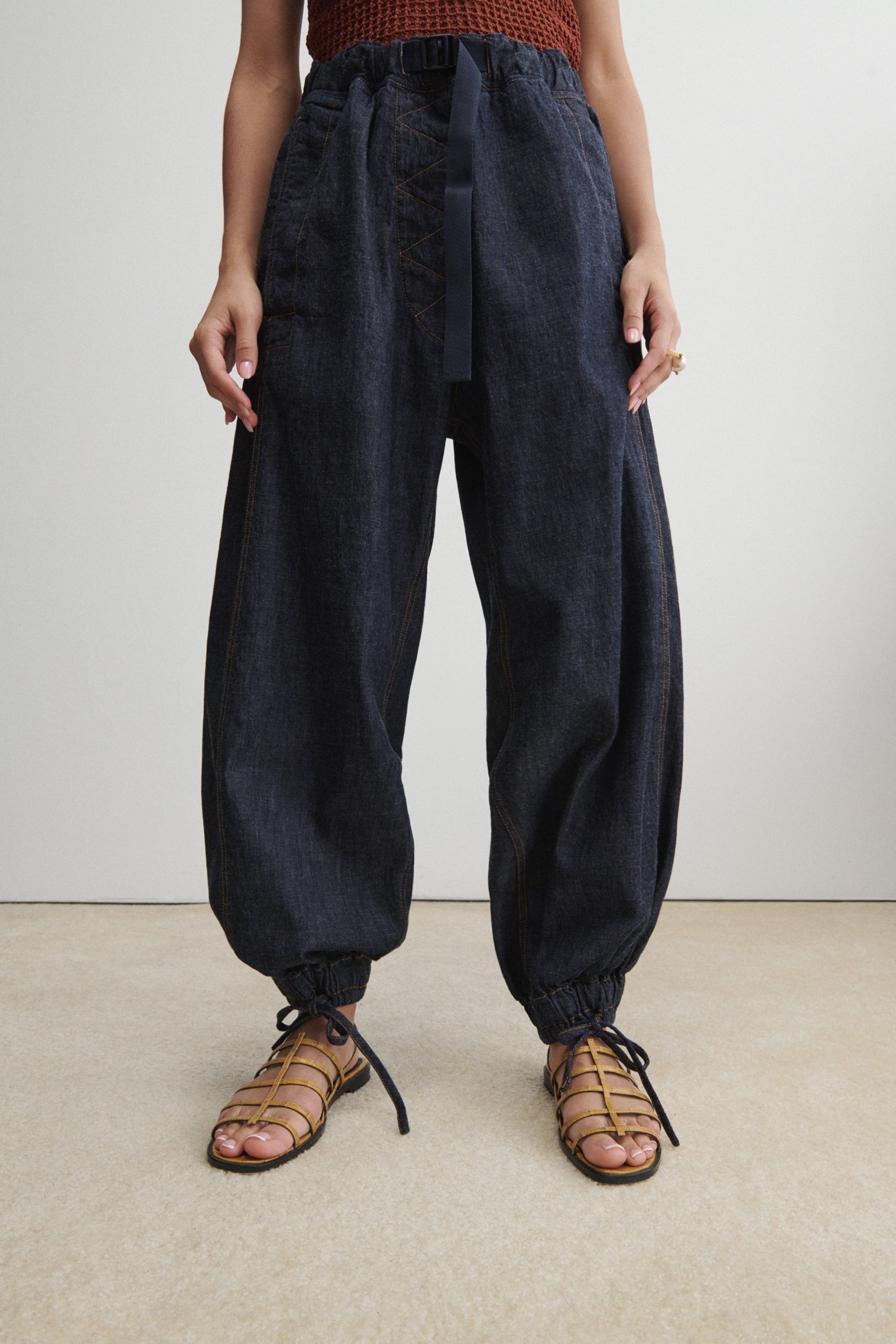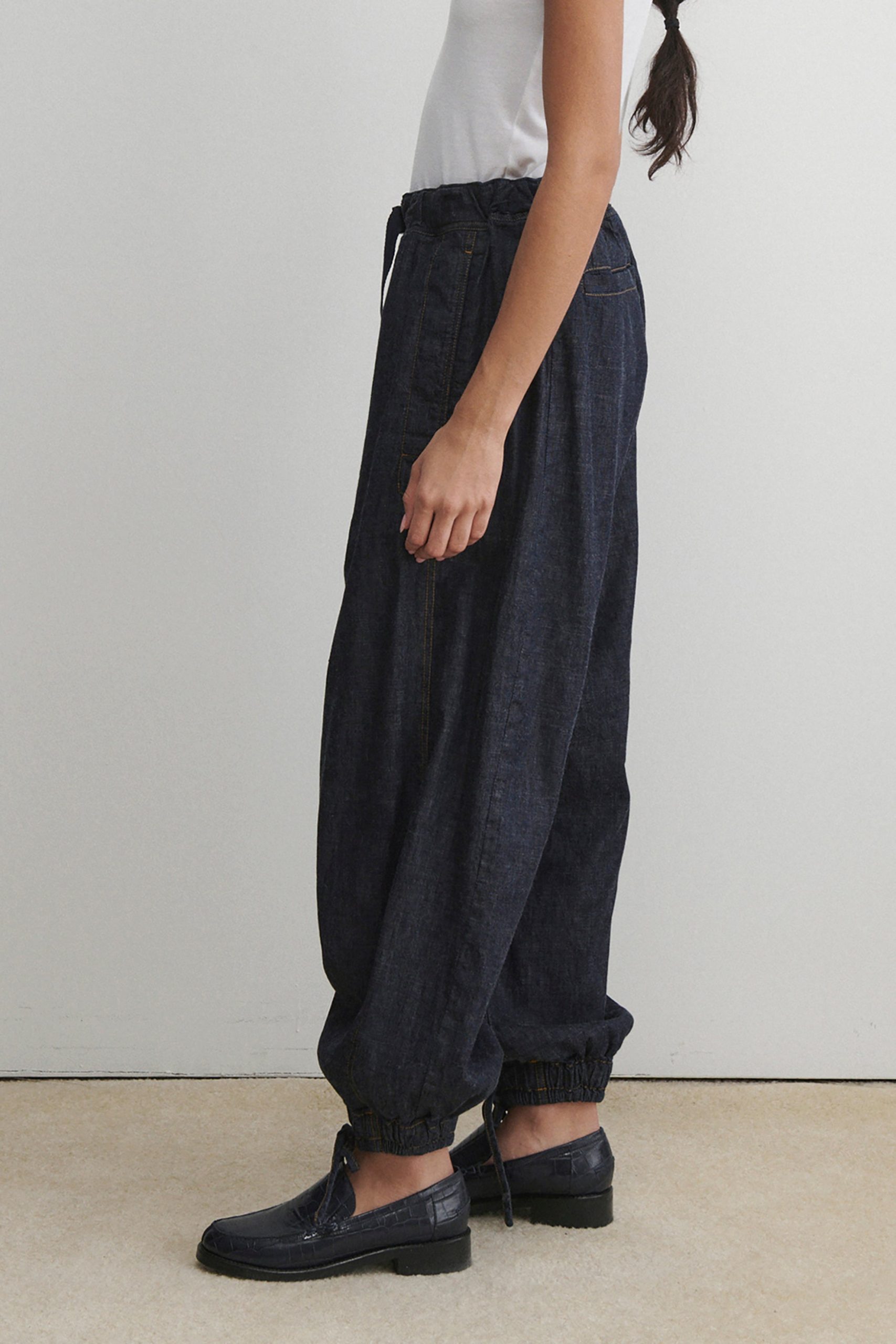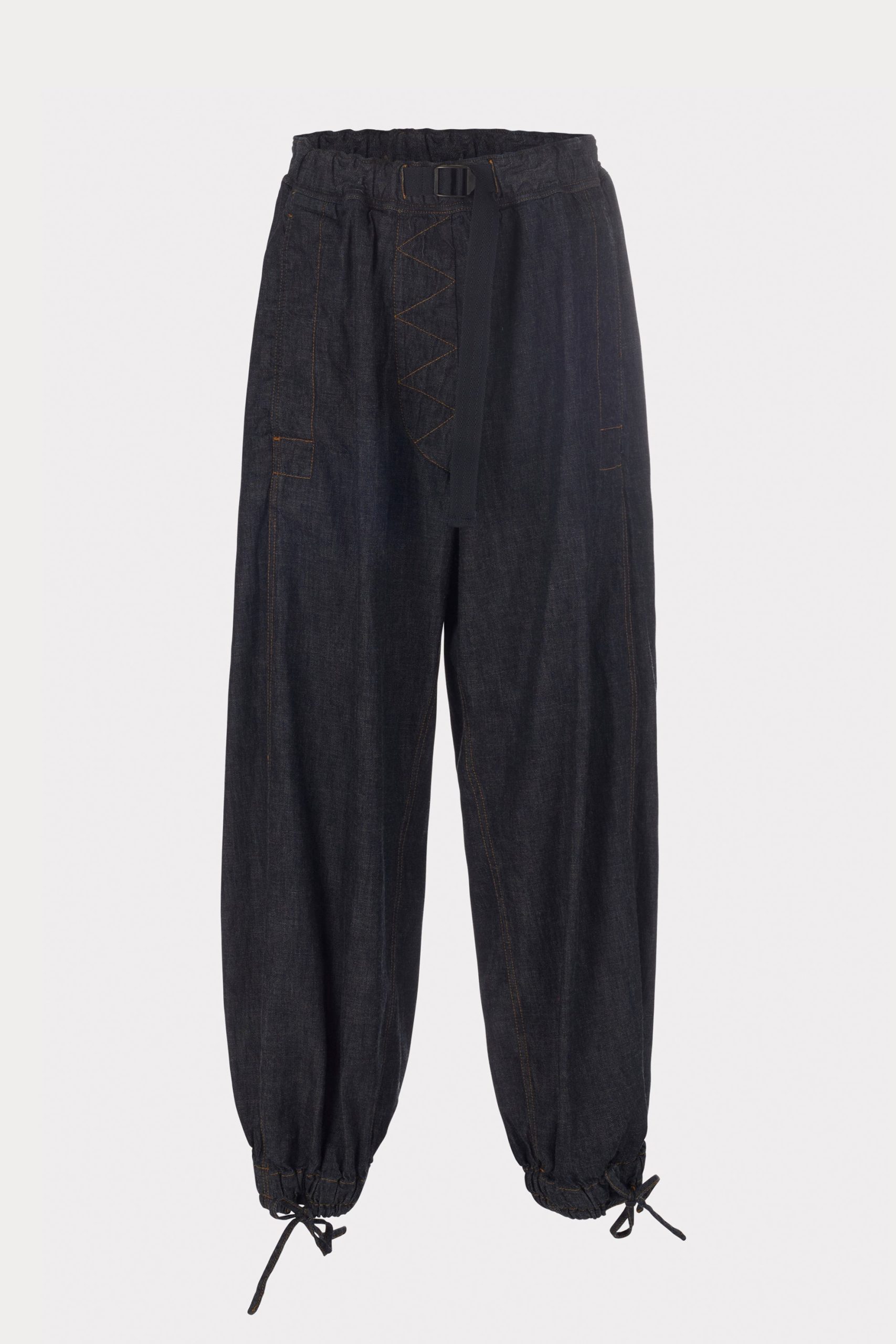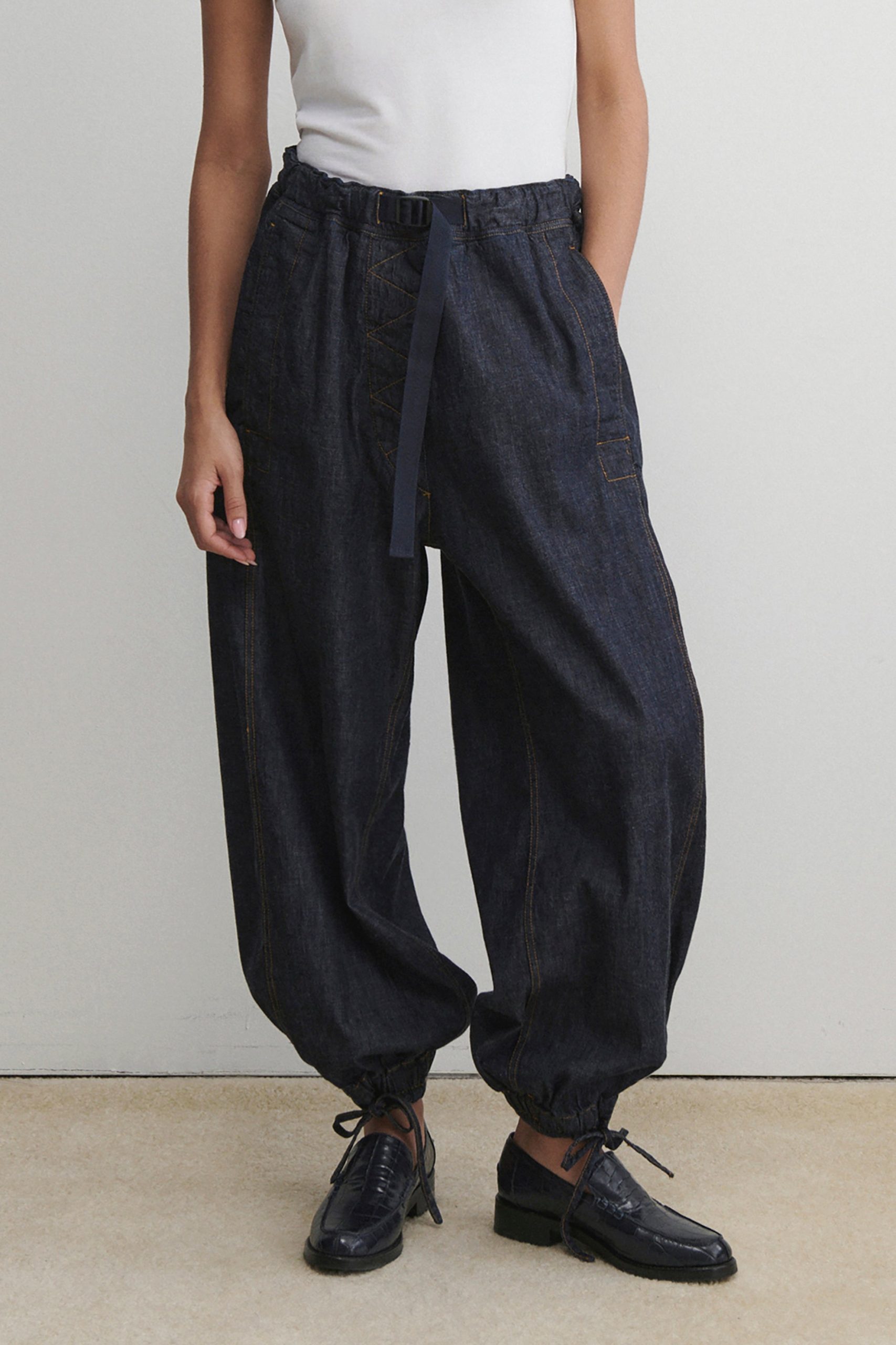 Baggy, parachute-styled pant in dark indigo Raw Vista Denim with topstitch detailing and a corded belt closure at waist. Features elasticated ankle cuffs with adjustable drawstrings to create a voluminous leg.