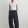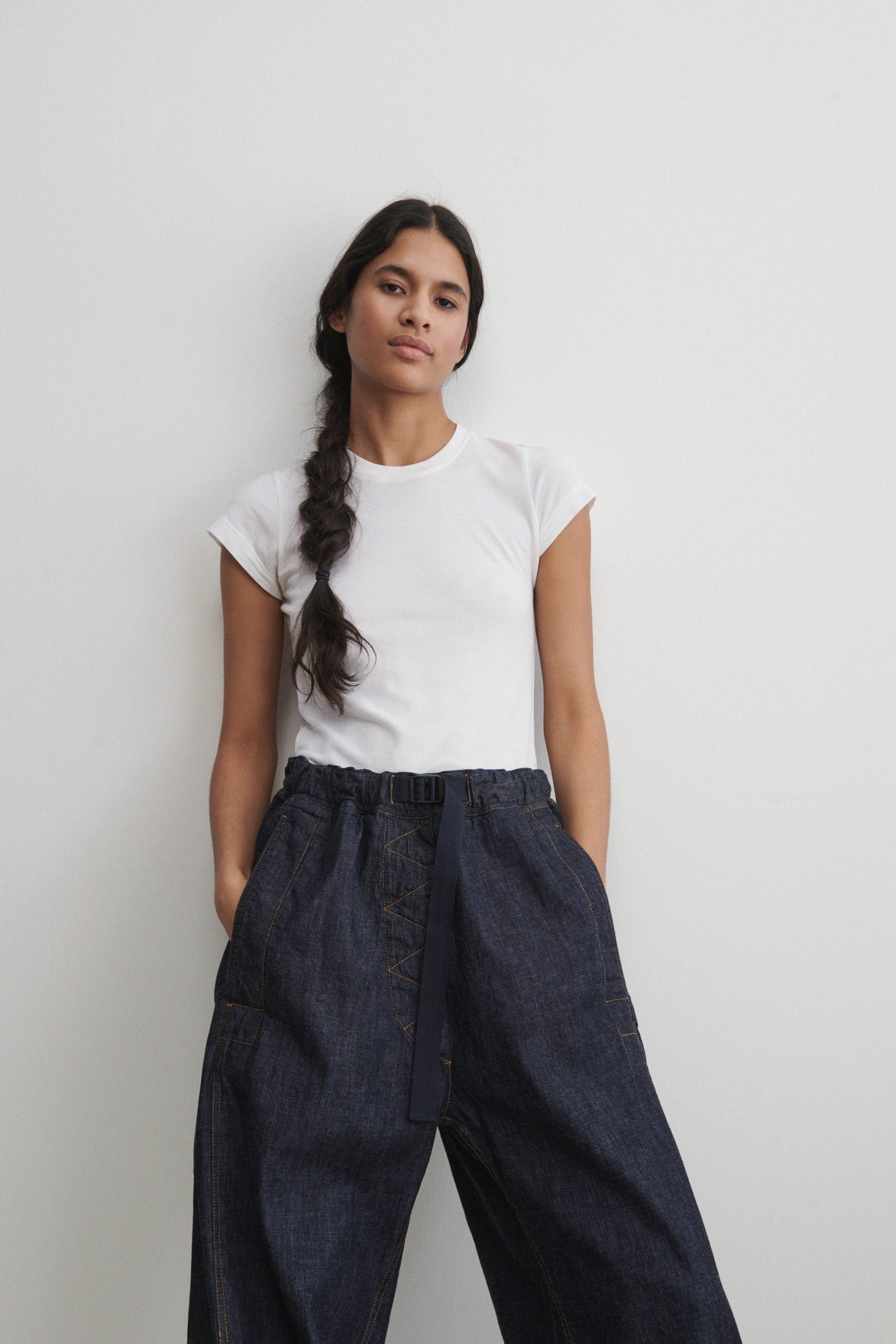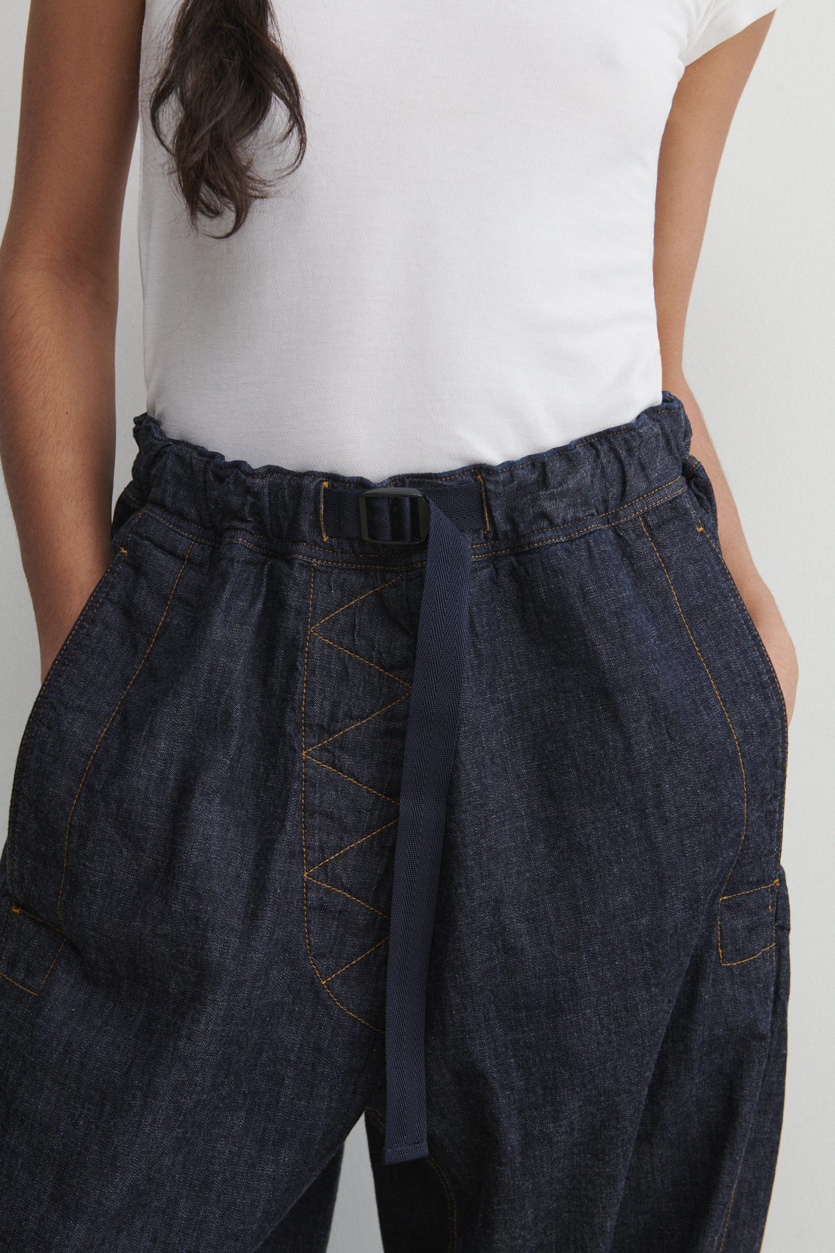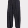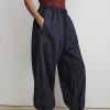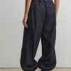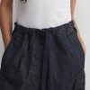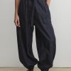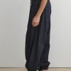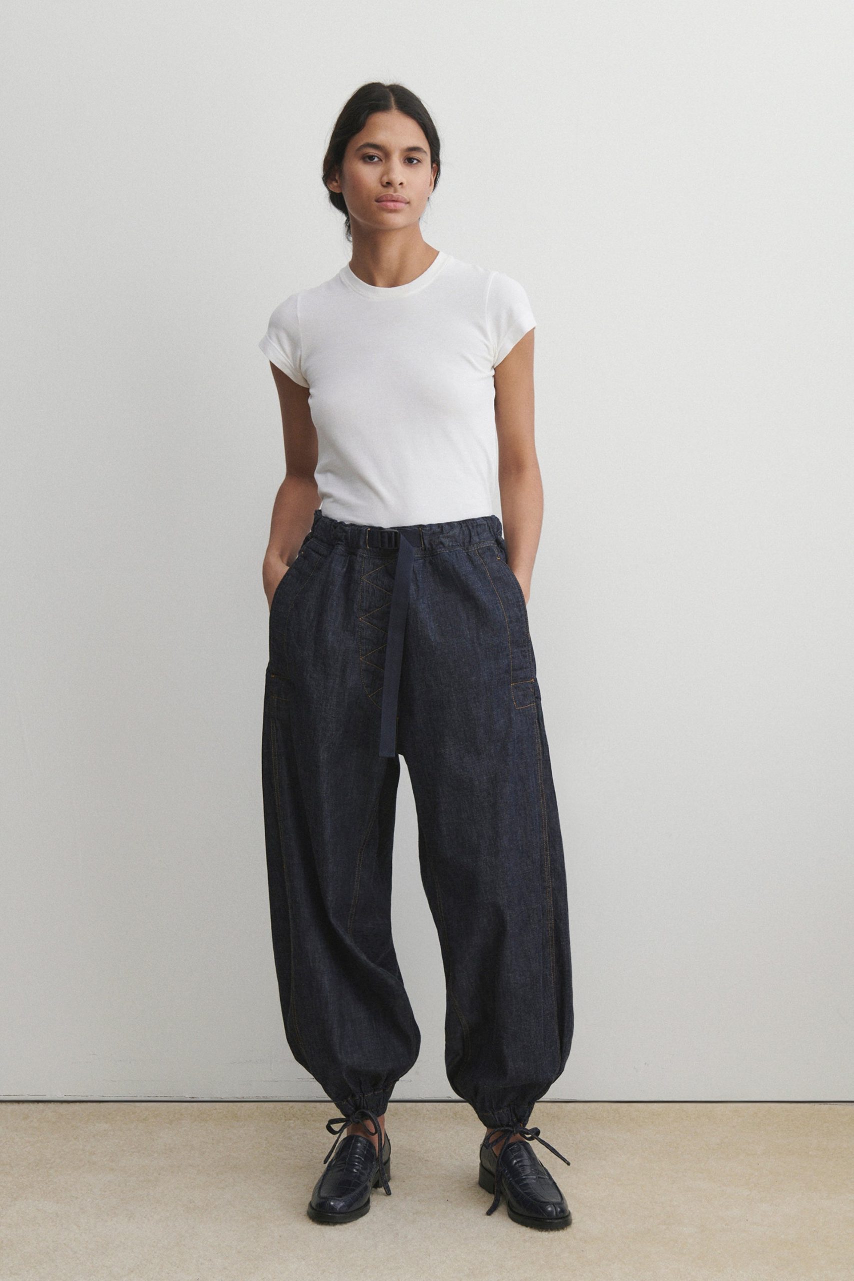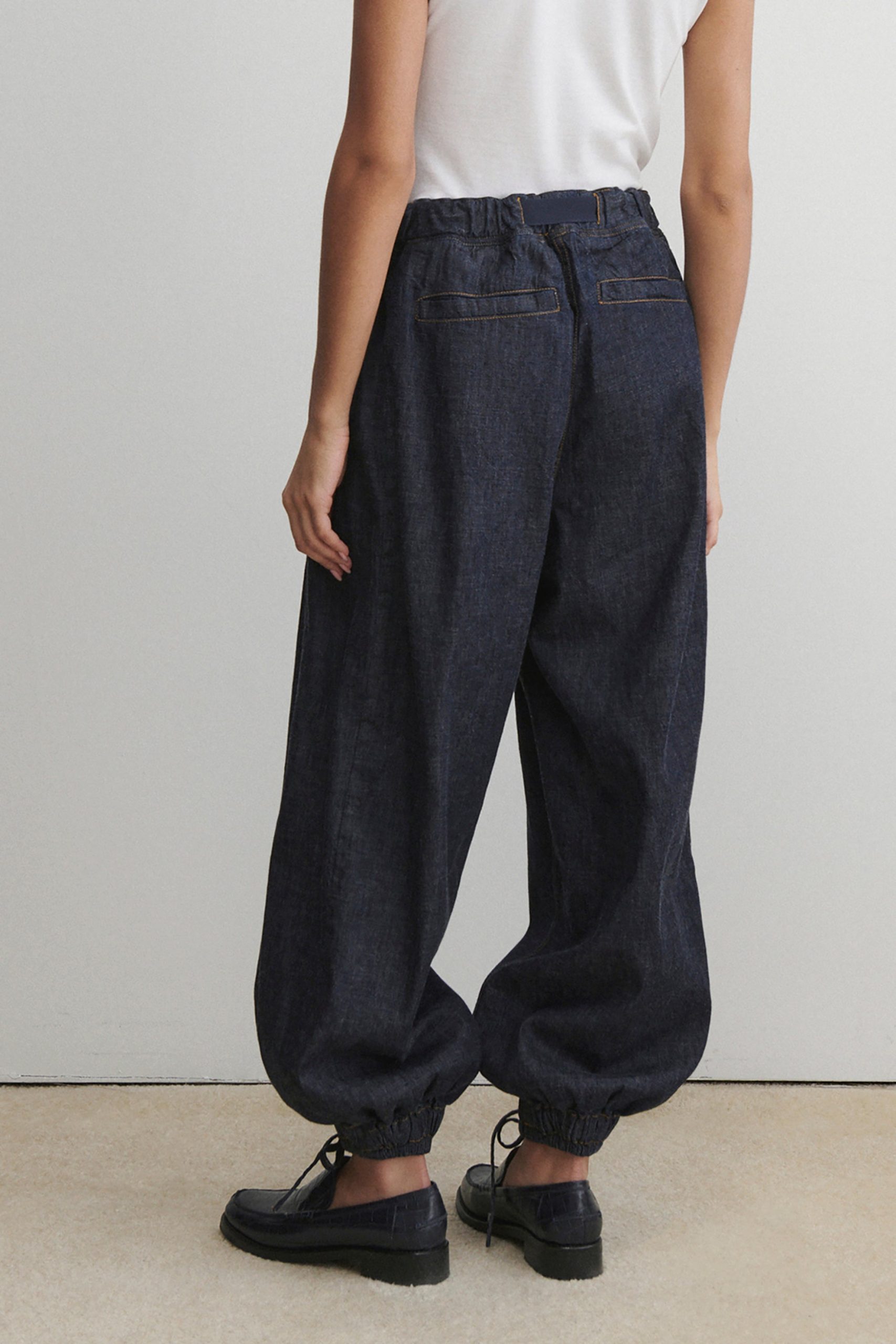 Baggy, parachute-styled pant in dark indigo Raw Vista Denim with topstitch detailing and a corded belt closure at waist. Features elasticated ankle cuffs with adjustable drawstrings to create a voluminous leg.