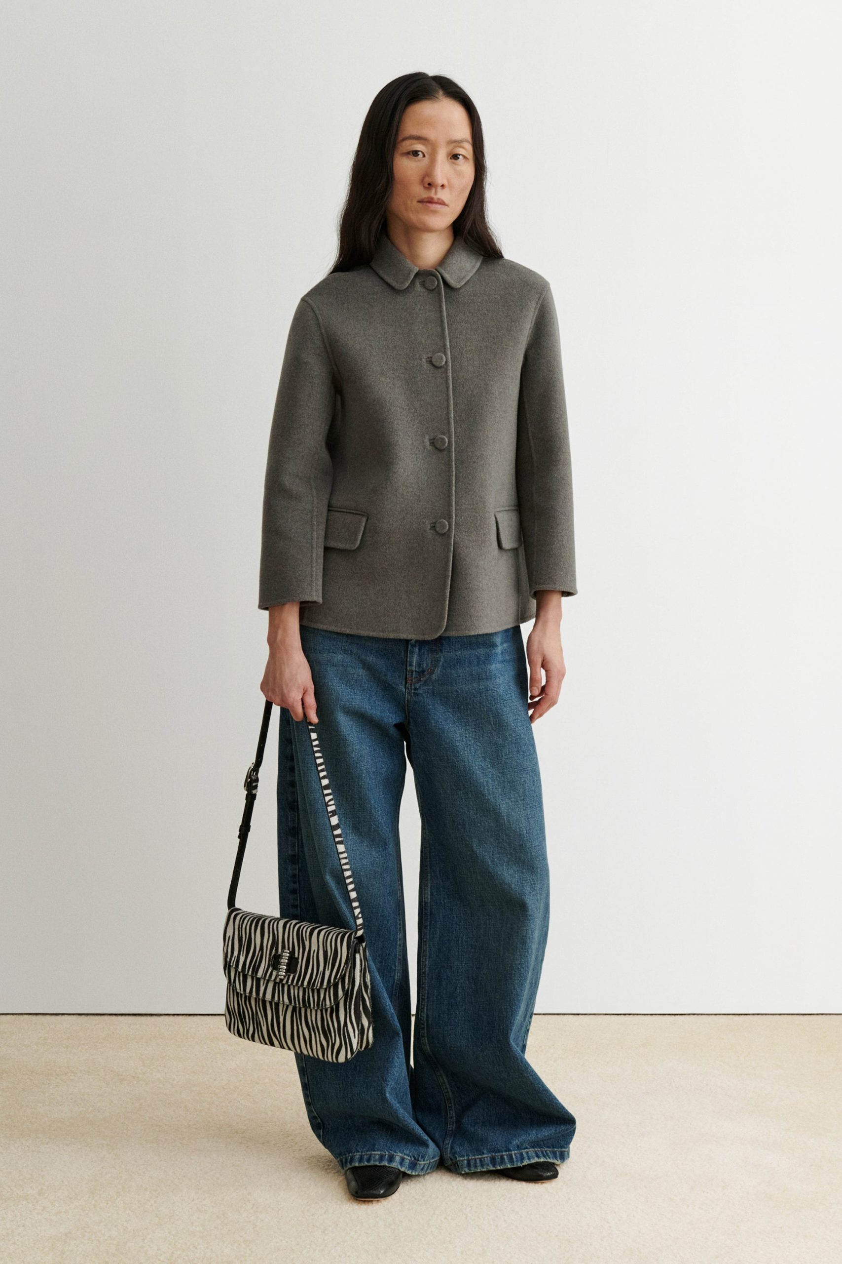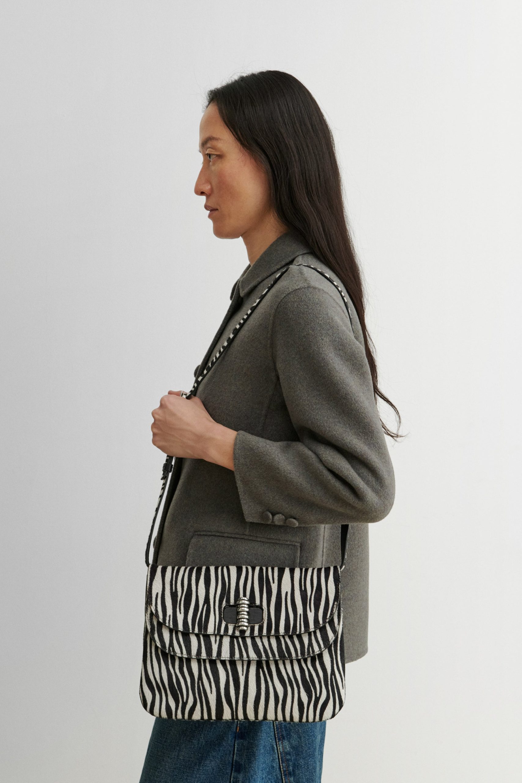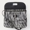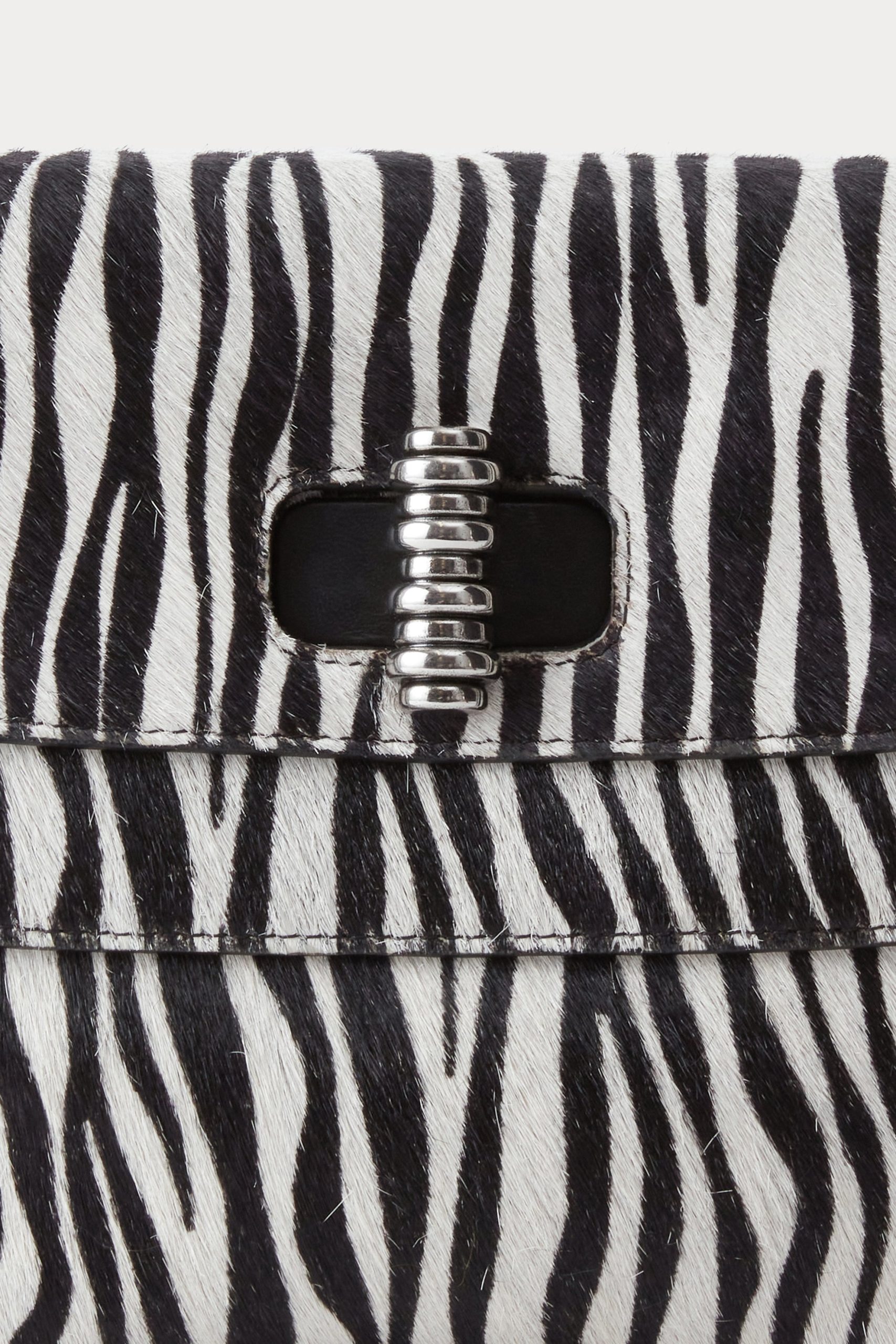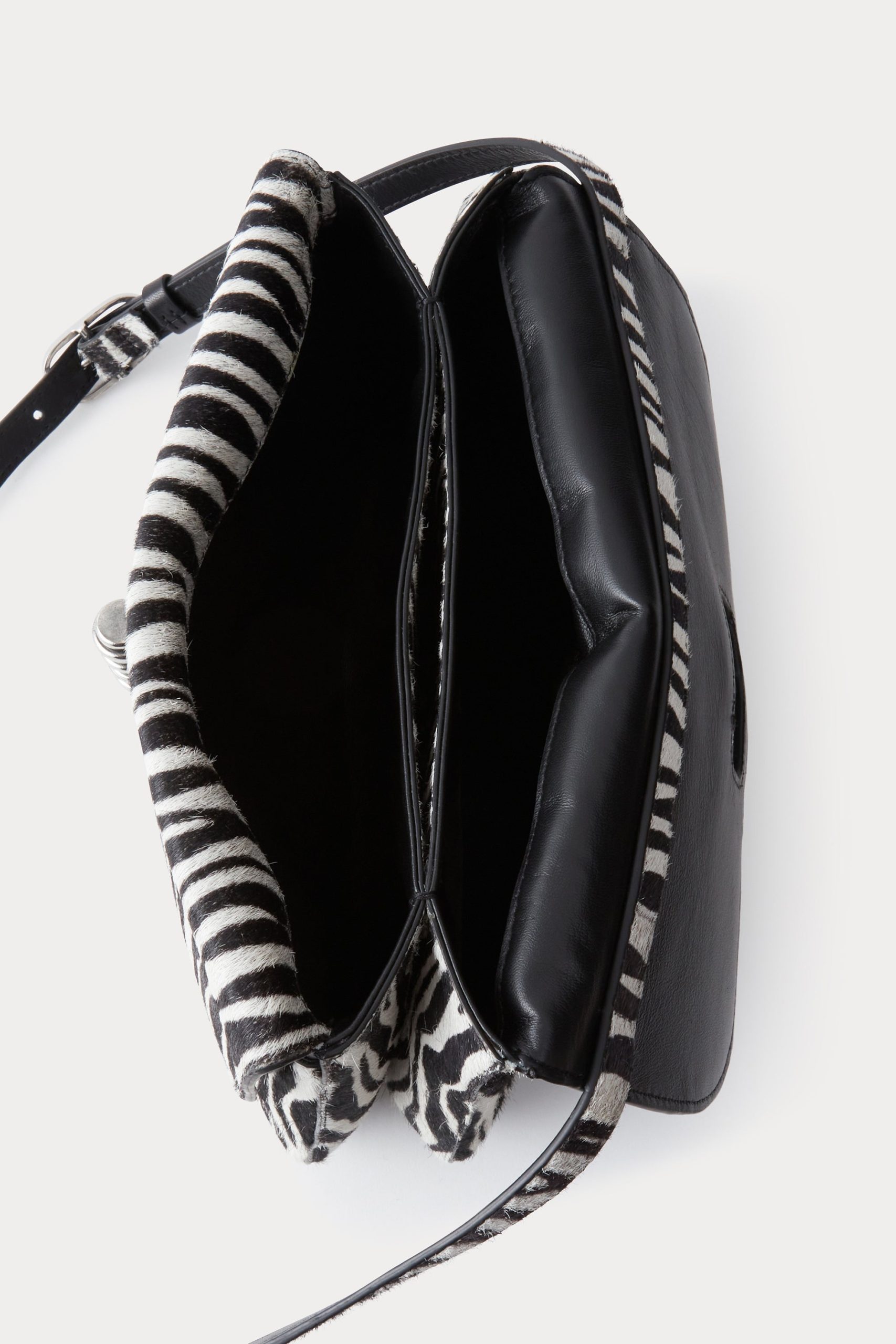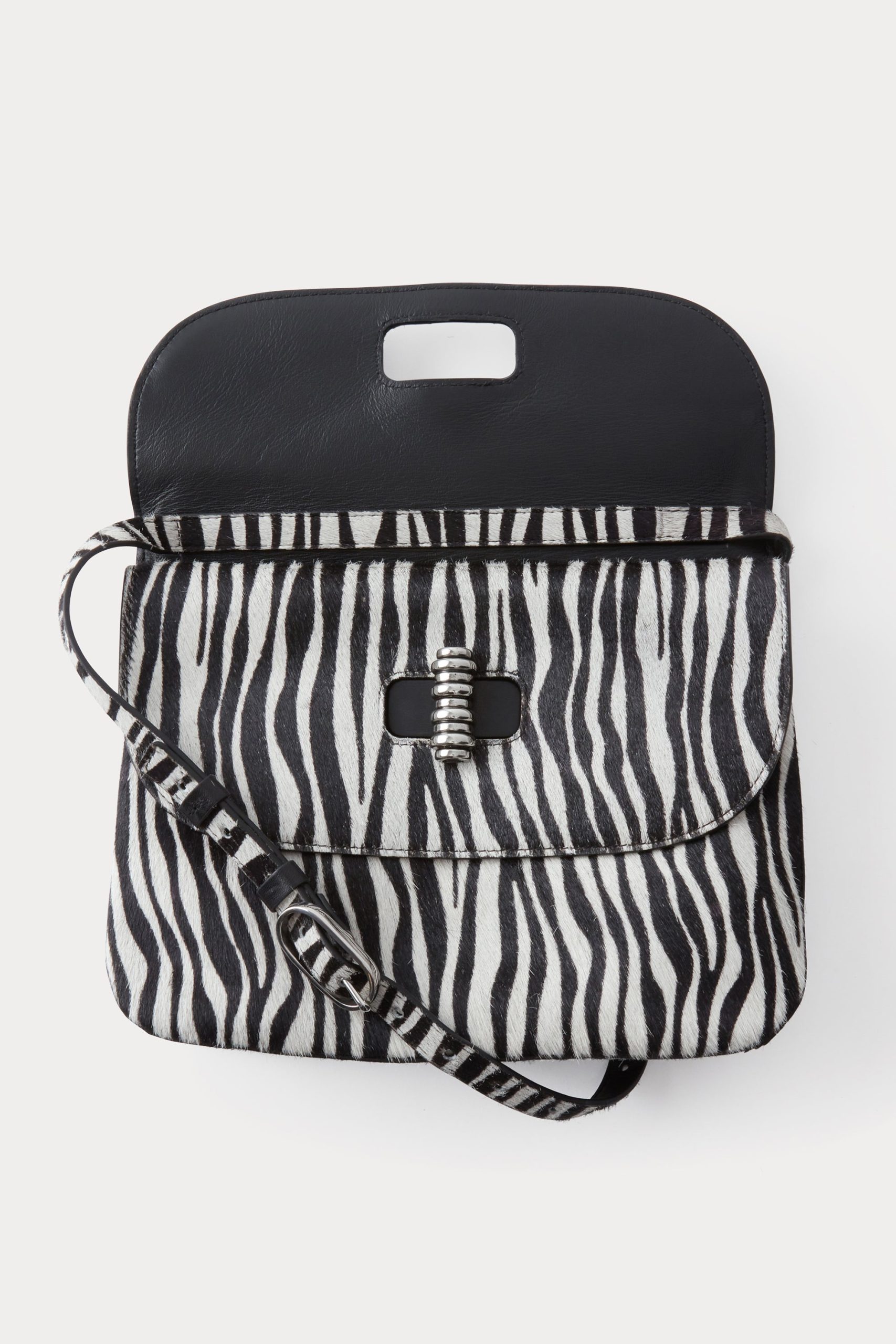 A spacious bag for one who refuses to give in to the ubiquity of the tote bag. This structured shoulder bag in zebra-printed calf hair offers a unique look for day or night. Features a double flap detail, long adjustable strap, and a textured metal Turnlock closure. Well-sized for a sketch book and everyday necessities.
